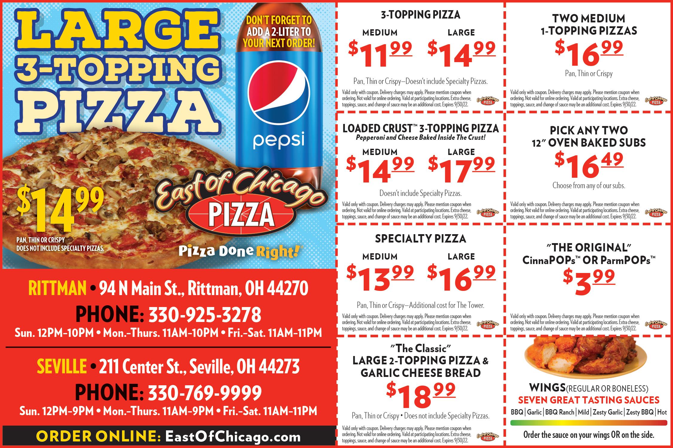 330-334-9191 • www.gioninos.com 138 Akron Rd. • Wadsworth • (Serving Wadsworth & Sharon Twp.-up to Rt. 18) Delivery Available • $10 Minimum Order • Limited Area GIONINO’S PIZZERIA Coupon expires 9-1-2022. Not valid with any other offer. Valid only at Wadsworth location. TMS GIONINO’S PIZZERIA Coupon expires 9-1-2022. Not valid with any other offer. Valid only at Wadsworth location. TMS GIONINO’S PIZZERIA Coupon expires 9-1-2022. Not valid with any other offer. Valid only at Wadsworth location. TMS GIONINO’S PIZZERIA Coupon expires 9-1-2022. Not valid with any other offer. Valid only at Wadsworth location. TMS GIONINO’S PIZZERIA Coupon expires 9-1-2022. Not valid with any other offer. Valid only at Wadsworth location. TMS GIONINO’S PIZZERIA Coupon expires 9-1-2022. Not valid with any other offer. Valid only at Wadsworth location. TMS GIONINO’S PIZZERIA (Excludes Steak) Coupon expires 9-1-2022. Not valid with any other offer. Valid only at Wadsworth location. TMS GIONINO’S PIZZERIA Coupon expires 9-1-2022. Not valid with any other offer. Valid only at Wadsworth location. TMS GIONINO’S PIZZERIA Coupon expires 9-1-2022. Not valid with any other offer. Valid only at Wadsworth location. TMS GIONINO’S PIZZERIA Coupon expires 9-1-2022. Not valid with any other offer. Valid only at Wadsworth location. TMS GIONINO’S PIZZERIA Coupon expires 9-1-2022. Not valid with any other offer. Valid only at Wadsworth location. TMS GIONINO’S PIZZERIA Coupon expires 9-1-2022. Not valid with any other offer. Valid only at Wadsworth location. TMS FREE Small Cheese Pizza with Purchase of A Large Specialty Pizza Large 16” 2-Item Pizza Only $1795 Medium 12” Pizza With 2-Items Only $1195 Large 16” 1-Item Pizza, 12 Wings (Jumbo Reg. or Boneless) Only $2995 Any 2 Subs Only $1500 2 Medium 12” Pizzas With 1-Item Each Only $2095 Add a pint of cole slaw for $1.95 Large 16” 1-Item Pizza Only $1595 2 Large 16” Pizzas With 1-Item Each Only $3195 Grizzly Feast Large 16” 2-Item Pizza & 12pc. Chicken & JoJo’s Only $3895 Add a pint of cole slaw for $2.50 No Substitutions Mixed or All Dark Junior Grizzly Feast Medium 12” 2-Item Pizza & 8pc. Chicken & JoJo’s Only $2995 Add a pint of cole slaw for $2.50 No Substitutions Mixed or All Dark Sheet 1-Item Pizza Only $2595 24 hr. Notice GIONINO’S PIZZERIA Coupon expires 9-1-2022. Not valid with any other offer. Valid only at Wadsworth location. TMS GIONINO’S PIZZERIA Coupon expires 9-1-2022. Not valid with any other offer. Valid only at Wadsworth location. TMS Lunch Special 11am to 3pm Medium 1-Item Pizza Only $1000 (Pick-up Only) Open For Delivery or Pick-Up Chicken Special 12 Mixed Chicken Only $2095 Wing Special Large 16” 1-Item Pizza & a Box of JoJo’s Only $2395 No Substitutions Add a Pint of Cole Slaw for $250 GIONINO’S PIZZERIA Coupon expires 9-1-2022. Not valid with any other offer. Valid only at Wadsworth location. TMS GIONINO’S PIZZERIA Coupon expires 9-1-2022. Not valid with any other offer. Valid only at Wadsworth location. TMS $2900 $2200 No Substitutions 650 9” Chocolate Chunk GIONINO’S PIZZERIA Coupon expires 9-1-2022. Not valid with any other offer. Valid only at Wadsworth location. TMS $3295 Weekend Special WELCOME BACK FOOTBALL Large 1-Item Pizza Large Tossed Salad & Dozen Boneless or Jumbo Reg. Wings 2022 FOOTBALL SCHEDULES Sept. 11 at Carolina Sept. 18 NY Jets Sept. 22 Pittsburgh BROWNS OHIO STATE Sept. 3 Notre Dame Sept. 17 Arkansas St. Sept. 24 Wisconsin