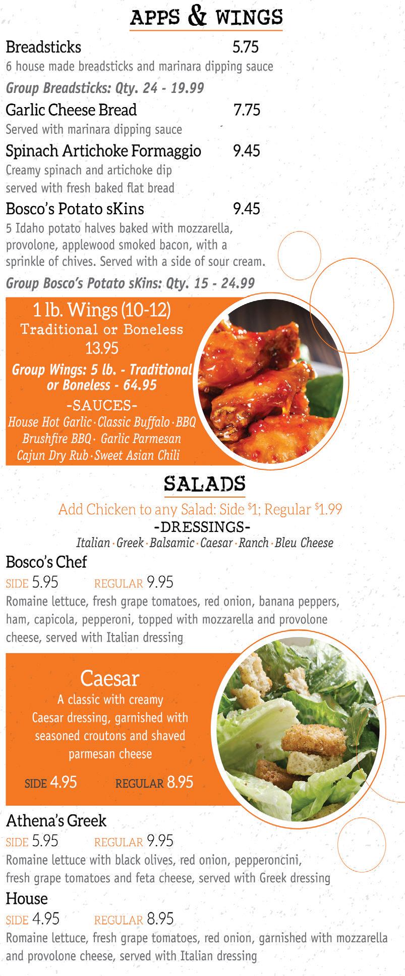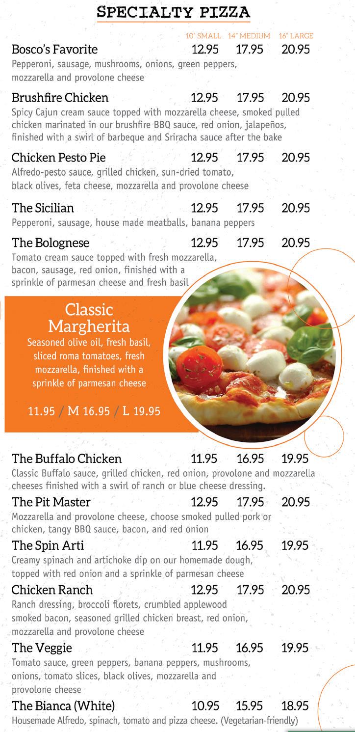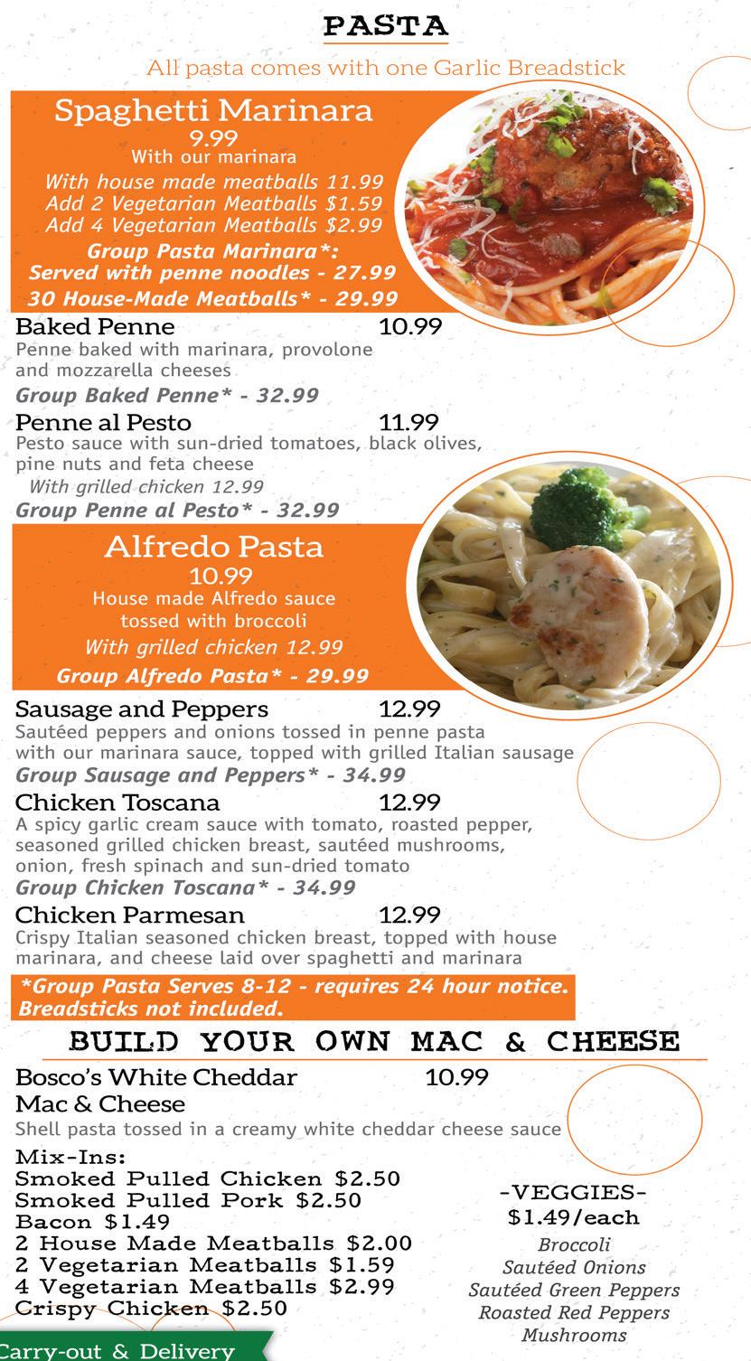 Order Online @ boscospizzakitchen.com (preferred) or call 330-331-5522 295 Weatherstone Dr. (Corner of 94) WADSWORTH ONLINE ORDER CODE TMS200 Coupon required. Not valid with any other offers or discounts. Premium toppings and delivery extra. One coupon per visit. Valid at Wadsworth location only. Expires 1/5/23 ONLINE ORDER CODE TMS203 Coupon required. Not valid with any other offers or discounts. Premium toppings extra. Carry-out only. One coupon per visit. Valid at Wadsworth location only. Expires 1/5/23 $12.99 $10.99 (CAULIFLOWER CRUST $3.50 EXTRA) LARGE 16” ONE TOPPING PIZZA ONLINE ORDER CODE TMS202 Coupon required. Not valid with any other offers or discounts. Premium toppings and delivery extra. One coupon per visit. Valid at Wadsworth location only. Expires 1/5/23 $25.99 TWO LARGE 16” TWO TOPPING PIZZAS CARRY-OUT SPECIAL MEDIUM 14” ONE TOPPING PIZZA ONLINE ORDER CODE TMS201 Coupon required. Not valid with any other offers or discounts. Premium toppings and delivery extra. One coupon per visit. Valid at Wadsworth location only. Expires 1/5/23 15% OFF ANY ONLINE ORDER @ REGULAR MENU PRICE DELIVERY & CARRY-OUT