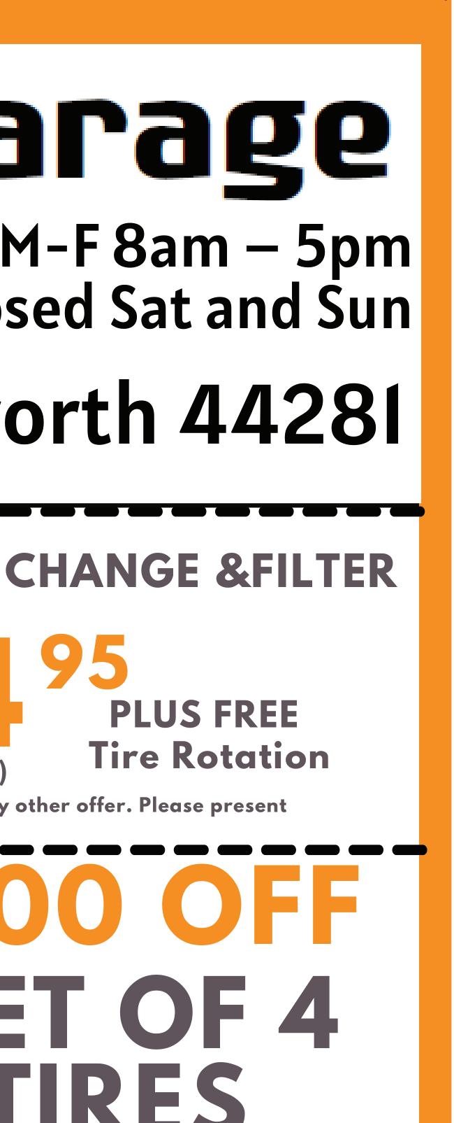 10 Tacos Beef or Chicken - Hard or Soft, Rice & Beans, Lettuce & Cheese, 2 Bags of Chips & 3 Salsas (Grilled Steak or Chicken $30) FAMILY PACK FAJITA DINNER (Feeds 4) Chicken $29.99 Steak $39.99 Shrimp $39.99 Includes Rice & Beans, Tortilla, Side of Lettuce & Sour Cream, 2 Large Chips & Large Salsa $3 OFF $25 or more dinner check 3725 South Cleveland-Massillon Rd, Norton Valid only with coupon. Not valid with any other 3725 South Cleveland-Massillon Rd, Norton Valid only with coupon. Not valid with any other SPEND $35 GET $5 OFF COMPLETE AUTO REPAIR / BODY SHOP / USED CAR SALES 350 Water St • Wadsworth • 330-336-6104 Body Shop FREE Estimates ALL INSURANCE CLAIMS WELCOME Ask us How we can SAVE YOU MONEY on Your Deductible! Valid with coupon. Not valid with any other offer. Expires 1/5/23 Valid with coupon. Not valid with any other offer. Expires 1/5/23 Valid with coupon. Not valid with any other offer. Expires 1/5/23 LUBE, OIL & FILTER CHANGE – PLUSFREE VEHICLE INSPECTION $3495 semi-synthetic up to 5 qts & filter 4 WHEEL ALIGNMENT AND TIRE ROTATION & BALANCE $8995 SPRAY IN TRUCK BED LINER $64995 Happy Holidays!