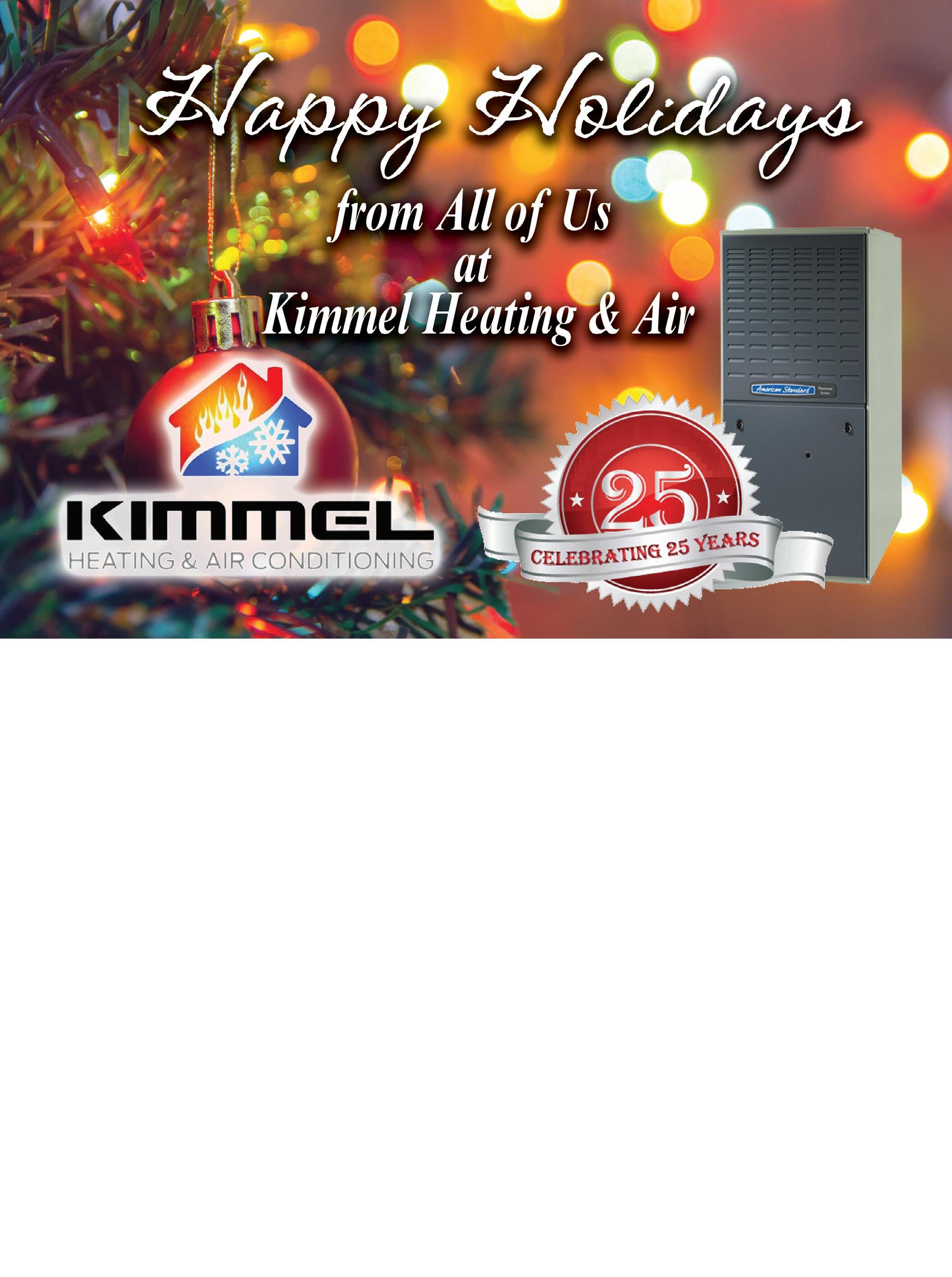 234-266-0088 License #15945 24 HOUR EMERGENCY SERVICE We Service All Makes & Models FURNACES – AIR CONDITIONERS – HUMIDIFIERS – HOT WATER TANKS – TANKLESS WATER HEATERS – HEAT PUMPS –AIR HANDLERS –BOILERS –TANKLESS BOILERS –THERMOSTATS –FILTERS –DIAGNOSTIC REPAIRS –WHOLE HOME AIR PURIFIERS –DUCT WORK – UV LIGHTS – MAINTENANCE PLANS – 24 HOUR EMERGENCY SERVICE – LOCAL FAMILY OWNED BUSINESSIN –25 YEARS IN BUSINESSFURNACES –AIR CONDITIONERS –HUMIDIFIERS –HOT WATER TANKS –TANKLESS WATER HEATERS –HEAT PUMPSFinancing Available* *Subject to credit approval, see store for details. www.kimmelheatingandair.com Residential, Commercial & New Construction Service Installation & Maintenance W Valid only during normal business hours. Cannot be combined with other offers. No additional discounts. Terms and conditions apply. Expires 1/5/2023 W Gas/Propane furnaces only, does not include boiler/oil furnaces. Valid only during normal business hours. Cannot be combined with other offers. No additional discounts. Terms and conditions apply. Expires 1/5/2023 $99 Tune & Check (regularly $129.00) $20 OFF New Customer $50 OFF Duct Cleaning & Tune Up (per furnace) W Valid only during normal business hours. Cannot be combined with other offers. No additional discounts. Terms and conditions apply. Expires 1/5/2023