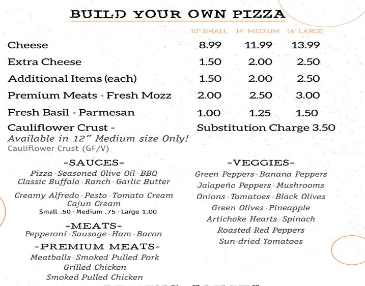330-334-9191 • www.gioninos.com 138 Akron Rd. • Wadsworth • (Serving Wadsworth & Pick-Up Only for Sharon Center) Delivery Available • $10 Minimum Order • Limited Area GIONINO’S PIZZERIA Coupon expires 1-5-2023. Not valid with any other offer. Valid only at Wadsworth location. TMS GIONINO’S PIZZERIA Coupon expires 1-5-2023. Not valid with any other offer. Valid only at Wadsworth location. TMS GIONINO’S PIZZERIA Coupon expires 1-5-2023. Not valid with any other offer. Valid only at Wadsworth location. TMS GIONINO’S PIZZERIA Coupon expires 1-5-2023. Not valid with any other offer. Valid only at Wadsworth location. TMS GIONINO’S PIZZERIA Coupon expires 1-5-2023. Not valid with any other offer. Valid only at Wadsworth location. TMS GIONINO’S PIZZERIA Coupon expires 1-5-2023. Not valid with any other offer. Valid only at Wadsworth location. TMS GIONINO’S PIZZERIA (Excludes Steak) Coupon expires 1-5-2023. Not valid with any other offer. Valid only at Wadsworth location. TMS GIONINO’S PIZZERIA Coupon expires 1-5-2023. Not valid with any other offer. Valid only at Wadsworth location. TMS GIONINO’S PIZZERIA Coupon expires 1-5-2023. Not valid with any other offer. Valid only at Wadsworth location. TMS GIONINO’S PIZZERIA Coupon expires 1-5-2023. Not valid with any other offer. Valid only at Wadsworth location. TMS GIONINO’S PIZZERIA Coupon expires 1-5-2023. Not valid with any other offer. Valid only at Wadsworth location. TMS GIONINO’S PIZZERIA Coupon expires 1-5-2023. Not valid with any other offer. Valid only at Wadsworth location. TMS FREE Small Gionino’s Bread with Purchase of A Large Specialty Pizza Large 16” 2-Item Pizza Only $1795 Medium 12” Pizza With 2-Items Only $1195 Large 16” 1-Item Pizza, 12 Wings (Jumbo Reg. or Boneless) Only $2995 Any 2 Subs Only $1500 2 Medium 12” Pizzas With 1-Item Each Only $2095 Add a pint of cole slaw for $1.95 Large 16” 1-Item Pizza Only $1595 2 Large 16” Pizzas With 1-Item Each Only $3195 Grizzly Feast Large 16” 2-Item Pizza & 12pc. Chicken & JoJo’s Only $3895 Add a pint of cole slaw for $2.50 No Substitutions Mixed or All Dark Junior Grizzly Feast Medium 12” 2-Item Pizza & 8pc. Chicken & JoJo’s Only $2995 Add a pint of cole slaw for $2.50 No Substitutions Mixed or All Dark Sheet 1-Item Pizza Only $2595 24 hr. Notice GIONINO’S PIZZERIA Coupon expires 1-5-2023. Not valid with any other offer. Valid only at Wadsworth location. TMS GIONINO’S PIZZERIA Coupon expires 1-5-2023. Not valid with any other offer. Valid only at Wadsworth location. TMS Lunch Special 11am to 3pm Medium 1-Item Pizza Only $900 (Pick-up Only) Open For Delivery or Pick-Up Chicken Special 12 Mixed Chicken Only $2095 Wing Special Large 16” 1-Item Pizza & a Box of JoJo’s Only $2395 No Substitutions Add a Pint of Cole Slaw for $250 GIONINO’S PIZZERIA Coupon expires 1-5-2023. Not valid with any other offer. Valid only at Wadsworth location. TMS GIONINO’S PIZZERIA Coupon expires 1-5-2023. Not valid with any other offer. Valid only at Wadsworth location. TMS $2900 $2200 No Substitutions GIONINO’S PIZZERIA Coupon expires 1-5-2023. Not valid with any other offer. Valid only at Wadsworth location. TMS $5399 Holiday Special Full Sheet 1-Item Pizza & 24 Wings (Reg. or Boneless) Catering Special $1200 OFF $100 or more on regular menu items 2022 BROWNS FOOTBALL SCHEDULE Dec. 4 at Houston Dec. 11 at Cincinnati Dec. 18 Baltimore Dec. 24 New Orleans Jan. 1 at Washington Jan. 8 at Pittsburgh Holiday Hours: Open Christmas Eve til 6pm Closed Christmas Day Open New Year’s Eve til 10pm Open New Year’s Day