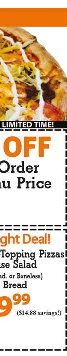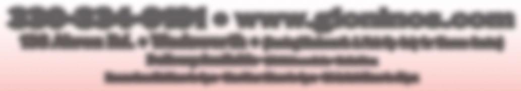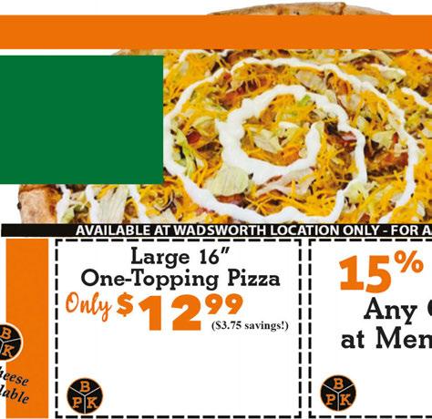 GIONINO’S PIZZERIA Coupon expires 5-30-24. Not valid with any other offer. Valid only at Wadsworth location. TMS GIONINO’S PIZZERIA Coupon expires 5-30-24. Not valid with any other offer. Valid only at Wadsworth location. TMS GIONINO’S PIZZERIA Coupon expires 5-30-24. Not valid with any other offer. Valid only at Wadsworth location. TMS GIONINO’S PIZZERIA Coupon expires 5-30-24. Not valid with any other offer. Valid only at Wadsworth location. TMS GIONINO’S PIZZERIA Coupon expires 5-30-24. Not valid with any other offer. Valid only at Wadsworth location. TMS GIONINO’S PIZZERIA Coupon expires 5-30-24. Not valid with any other offer. Valid only at Wadsworth location. TMS GIONINO’S PIZZERIA Coupon expires 5-30-24. Not valid with any other offer. Valid only at Wadsworth location. TMS GIONINO’S PIZZERIA Coupon expires 5-30-24. Not valid with any other offer. Valid only at Wadsworth location. TMS GIONINO’S PIZZERIA Coupon expires 5-30-24. Not valid with any other offer. Valid only at Wadsworth location. TMS Large 16” 2-Item Pizza Only $1795 Medium 12” Pizza With 2-Items Only $1195 Large 16” 1-Item Pizza, 12 Wings (Jumbo Reg. or Boneless) Only $3195 Any 2 Subs Only $1500 2 Medium 12” Pizzas With 1-Item Each Only $2195 Add a pint of cole slaw for $1.95 Large 16” 1-Item Pizza Only $1595 2 Large 16” Pizzas With 1-Item Each Only $3195 Junior Grizzly Feast Medium 12” 2-Item Pizza & 8pc. Chicken & JoJo’s Only $3295 Add a pint of cole slaw for $3.50 No Substitutions • Mixed or All Dark GIONINO’S PIZZERIA Coupon expires 5-30-24. Not valid with any other offer. Valid only at Wadsworth location. TMS Lunch Special 11am to 3pm Medium 1-Item Pizza Only $1000 (Pick-up Only) Medium Gionino Bread Only $925 Large 16” 1-Item Pizza & a Box of JoJo’s Only $2599 No Substitutions GIONINO’S PIZZERIA Coupon expires 5-30-24. Not valid with any other offer. Valid only at Wadsworth location. TMS GIONINO’S PIZZERIA Coupon expires 5-30-24. Not valid with any other offer. Valid only at Wadsworth location. TMS Grizzly Feast Large 16” 2-Item Pizza & 12pc. Chicken & JoJo’s Only $4295 Add a pint of cole slaw for $3.50 No Substitutions • Mixed or All Dark NEW 330-334-9191 • www.gioninos.com 138 Akron Rd. • Wadsworth • (Serving Wadsworth & Pick-Up Only for Sharon Center) Delivery Available • $10 Minimum Order • Limited Area Hours: Sun 10:30am to 9pm • Mon-Thur 10am to 9pm • Fri & Sat 10am to 10pm Open For Delivery or Pick-Up