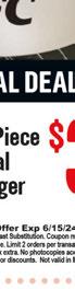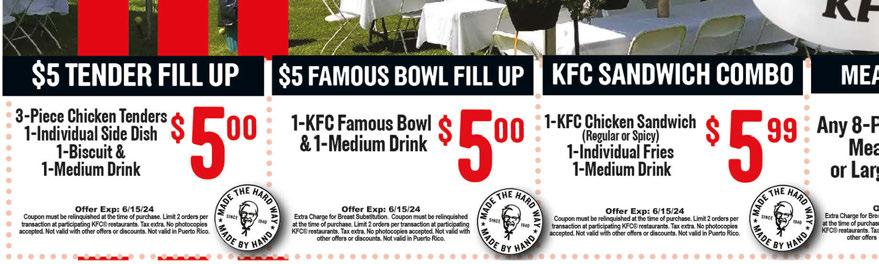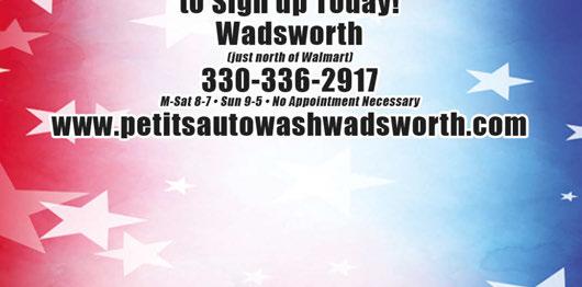 WADSWORTH May 2024 Shop locally. Save locally. Scan our QR code to fi nd your perfect invitation! To advertise, call 330.802.0290 SERVICE OFF OF ANY SERVICE UP TO $100 OFF EXCLUDES TIRES Cannot be comb ned with any other offer Expires: 6/15/24 10 % TMS CHARGING& STARTING OFF CHARGING AND STARTING REPAIRS UP TO $200 OFF Cannot be combined with any other offer Expires: 6/15/24 20% TMS POTHOLE SPECIAL 99.95 Expires: 6/15/24 TMS $ Cannot be comb ned w th any other offer $40SAVINGS! INCLUDES: 4 WHEEL ALIGNMENT and 4 TIRE BALANCE Spring Sa ings s sttart t at ann’s Tire Pross! Valid with coupon. Not valid with any other offer or specials. Expires 5/30/24 For a Full Menu: www.whitehousechicken. com WADSWORTH 330-335-6000 199 Great Oaks Trail Hours: Mon 4pm-8pm Tues, Wed, Thurs 4pm-9pm Fri & Sat 11am-9pm • Sun 11am-8pm Buy 2 Classic Chicken Dinners Get a 3rd Classic Chicken Dinner FREE Buy a 16pc Mixed or 15pc Tender Bucket Get $5.00 OFF NOT VALID IN CONJUNCTION WITH ANY ONLINE CHOW NOW ORDERS. NOT VALID ON MOTHER’S DAY. NOT VALID IN CONJUNCTION WITH ANY ONLINE CHOW NOW ORDERS. NOT VALID ON MOTHER’S DAY. Limit one coupon per customer. Must present coupon at time of purchase. Not valid with any other offer. Valid at Wadsworth location only. Expires 5/30/24 TMS Limit one coupon per customer. Must present coupon at time of purchase. Not valid with any other offer. Valid at Wadsworth location only. Expires 5/30/24 TMS Order with ChowNow or @www.whitehousechicken.com go to online ordering or on our Facebook Page DOWNLOAD OUR NEW APP TODAY! Downtown Wadsworth 146 Main Street Wadsworth BREAKFAST 2 Eggs, Choice of Homefries, Fruit or Grits with Toast • Bacon, Sausage or Ham $599 Valid Mon-Fri till 11am Only Valid only with coupon. Not valid with any other offer or specials. Expires 5-30-24 Valid Mon-Fri Open till 11am Only Valid only with coupon. Not valid with any other offer or specials. Expires 5-30-24 ALEXANDRI’S FAMILY RESTAURANT DINNER FOR TWO Choice of Chop Steak, Orange Chicken or Clam Strips $2249 Includes Potato & Vegetable, Soup & Salad Bar Valid 11am till Close Valid only with coupon. Not valid with any other offer or specials. Expires 5-30-24 Includes Potato or Vegetable, Soup or 1 trip to Salad Bar ALEXANDRI’S FAMILY RESTAURANT Specials excluded. Valid only with coupon. Not valid with any other offer or specials. Expires 5-30-24 ALEXANDRI’S FAMILY RESTAURANT limit 2 per table limit 2 per table BREAKFAST 2 Pancakes or 2 French Toast, Choice of Bacon, Sausage or Ham $599 ALEXANDRI’S FAMILY RESTAURANT ALEXANDRI’S FAMILY RESTAURANT (Limit 2 per coupon) ALEXANDRI’S FAMILY RESTAURANT Each Valid only with coupon. Not valid with any other offer or specials. Expires 5-30-24 Valid 11am till Close Valid 11am till Close Valid only with coupon. Not valid with any other offer or specials. Expires 5-30-24 DINNER SPECIAL 1/2 Dozen Breaded Jumbo Shrimp $945 ALEXANDRI’S RESTAURANT “Great Food, Great Service, Unbeatable Prices” Serving Medina County 30 Years! APPETIZERS Stuffed Grape Leaves $599 Includes Pita Bread & Tzatziki 10% OFF Your Total Bill MUST ORDER OFF REGULAR MENU ONLY Valid All Day MOTHER’S DAY MENU Every Wednesday & Friday All-U-Can-Eat Hand Breaded Fish Fry