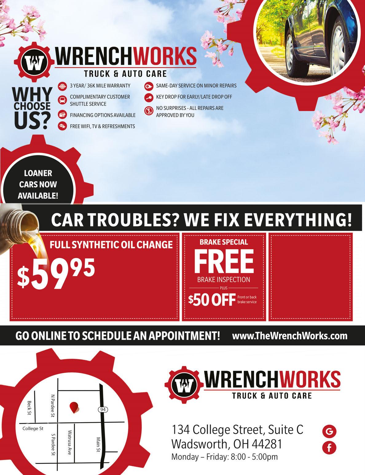 Roadsideassistance Vehiclelockout Batteryjumpstart Flattirechange Winchingservice Roadsi WithBatteryPurchase FREE TOWING Withanyrepair over$100 FREE INSTALLATION (WithinWadsworthCityLimits)ValidonlywithJack Jack'sTowingwithcoupon.Notvalidwithanyother offers.Pleasepresentcouponbeforeservice.Expires 5/2/2024 BrakeSpecial $189peraxleplusparts Withcoupon.Notvalidwithanyotheroffer.Please presentbeforeserviceExpires5/2/2024 Hours:M-F8am–5pm Validwithcoupononly.Notvalidwithanyotheroffer.Pleasepresentbefore service.Foreigncars&trucksmaybeslightlyhigher.Expires5/2/2024 SOLDHERE $44 (Upto5qts.) A/CSPECIAL FullSyntheticOil Change&Filter 330-336-8530 3 3 0 3 3 6 8 5 3 0 400CollegeStWadsworth .95 Validwithcoupononly.Notvalidwithanyotheroffer.Please presentbeforeservice.Foreigncars&trucksmaybeslightly higher.Expires5/2/2024 .95 Evacuateandrecharge Upto2lbs.R134AType Validwithcoupononly.Notvalidwithanyotheroffer. Pleasepresentbeforeservice.Expires5/2/2024 $99 SPRINGSPECIAL .95 Fullsyntheticoilchange,wiper bladesandcoolantflush Validwithcoupononly.Notvalidwithanyotheroffer.Please presentbeforeservice.Foreigncars&trucksmaybeslightlyhigher. Expires5/2/2024 $99.95 Valid with coupon only. Not valid with any other o er. Please present before service. Foreign cars & trucks may be slightly higher. Expires 5/30/2024 Valid with coupon only. Not valid with any other o er. Please present before service. Foreign cars & trucks may be slightly higher. Expires 5/30/2024 (Within Wadsworth City Limits) Valid only with Jack Jack’s Towing with coupon. Not valid with any other o ers. Please present coupon before service. Expires 5/30/2024 Valid with coupon only. Not valid with any other o er. Please present before service Expires 5/30/2024 Valid with coupon only. Not valid with any other o er. Please present before service Expires 5/30/2024 Valid with coupon only. Not valid with any other o er. Please present before service. Foreign cars & trucks may be slightly higher. Expires 5/30/2024
