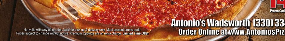 COMPLETE AUTOMOTIVE & TRANSMISSION SERVICE Doing Business the “Old Fashion Way” HONEST! WE BUY CARS! WE WORK ON AMERICAN MOTORCYCLES $100PaymentReferral If you send a new customer for a transmission (rebuild or replacement) $100 in cash for completed repair HERE FOR ALL YOUR AUTOMOTIVE & TRANSMISSION NEEDS Veteran & Senior Discount 330-334-4227 349 Main Street • Wadsworth (1/2 a mile south of the square) A/C SERVICE $5995 (INCLUDES UP TO 1LB R134A) Most cars. Valid Only With Coupon. Not Valid With Any Other Offers. Expires 5/30/24. Most cars. Valid Only With Coupon. Not Valid With Any Other Offers. Expires 5/30/24. Most cars. Valid Only With Coupon. Not Valid With Any Other Offers. Expires 5/30/24. BRAKE SPECIAL CERAMIC PADS & NEW ROTORS $19995 FREE TRANSMISSION DIAGNOSIS PLUS 10% OFF ANY TRANSMISSION REPAIR (UP TO $100) R/T AUTOMOTIVE & TRANSMISSION SPRING IS HERE!!! Carry out only. Not valid with any other offer or special. Must bring in coupon. Expires 5/30/24 Not valid with any other offer or special. Must bring in coupon. Expires 5/30/24. Not valid with any other offer or special. Must bring in coupon. Expires 5/30/24. Carry out only. Not valid with any other offer or special. Must bring in coupon. Expires 5/30/24. Carry out only. Not valid with any other offer or special. Must bring in coupon. Expires 5/30/24. Carry out only. Not valid with any other offer or special. Must bring in coupon. Expires 5/30/24. W W W W W W 2 Medium Two Item Pizzas $27.99 Large Two Items Pizza $16.99 2 Large One Item Pizzas $31.99 DINE-IN ONLY $5.00 OFF Any Purchase of $35 or More DINE-IN OR CARRY OUT 2 Italian Subs $15.00 12pc Chicken, JoJo’s, Pint of Coleslaw & Pint of Hot Sauce $24.99 Patio Opening Soon!