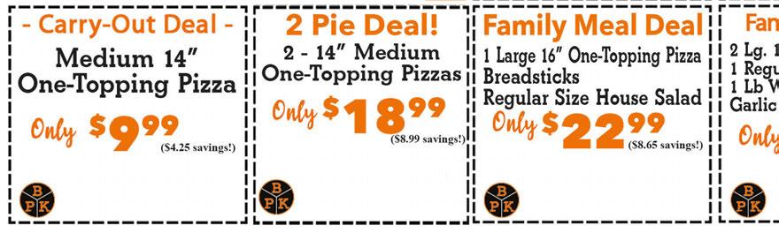 $30.00 or More Purchase $30.00 or More Purchase DINE IN/CARRYOUT AVAILABLE $35.00 or More Purchase $35.00 or More Purchase 5-30-2024 5-30-2024 5-30-2024 5-30-2024 Join us for Cinco de Mayo! JOIN US ON THE PATIO $5 OFF barlett-cook flowers Fresh Floral Arrangements of $25 or More CARRY OUT ONLY. Excludes wire orders. Not valid with any other offer. Expires 5-30-24 “Bosco’s Taco Pizza” Salsa, your choice of Taco Beef or Fajita Seasoned Chicken, cheddar cheese, red onion, nished with diced tomatoes, lettuce, and a swirl of sour cream Promo code: TMS200 Promo code: TMS15 Promo code: TMSFAM Promo code: TMSFMD Promo code: TMS999 Promo code: TMS1899 Coupon required. One coupon per visit. Offers cannot be combined. Delivery and premium toppings extra. Expires 6/30/24 Coupon required. One coupon per visit. Offers cannot be combined. Delivery and premium toppings extra. Expires 6/30/24 Coupon required. One coupon per visit. Offers cannot be combined. Delivery and premium toppings extra. Expires 6/30/24 Coupon required. One coupon per visit. Offers cannot be combined. Delivery and premium toppings extra. Expires 6/30/24 Coupon required. One coupon per visit. Offers cannot be combined. Premium toppings extra. Expires 6/30/24 Coupon required. One coupon per visit. Offers cannot be combined. Delivery and premium toppings extra.Expires 6/30/24 Order 5 Or More for Only $1099 ea. (phone orders only) “Bosco’s Taco Pizza” - Back for a Limited Time! To Advertise Call Laura, 330-350-2089