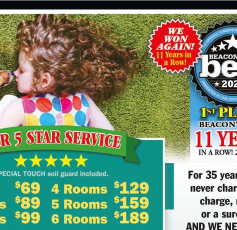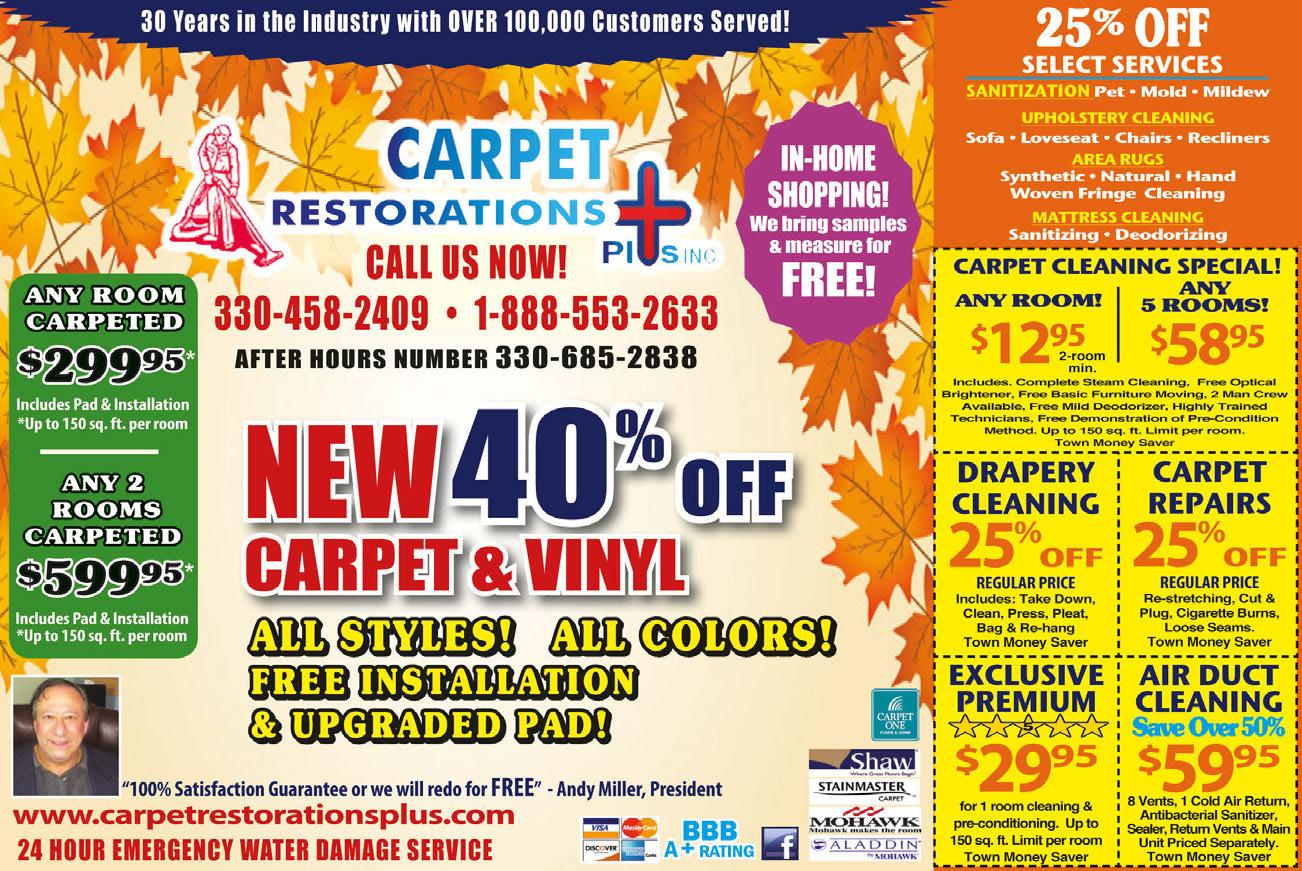 • Area Rugs FREE IN-HOME SHOPPING! WE BRING SAMPLES & MEASURE! 30 YEARS IN THE INDUSTRY WITH OVER 100,000 CUSTOMERS SERVED! PREMIUM CARPET CLEANING $ 34 95 Any Room Cleaned $ 29 95 Additional Rooms Exclusive Includes: Pre-Spotting, up to 150 sq. ft. per room / Additional sq. footage 25¢ per ft. Heavily soiled carpets may require total reconditioning. CARPET CLEANING SERVICES INCLUDED Complete Steam Cleaning • FREE Optical Brightener • FREE basic Furniture Moving • 2-man Crew Available • FREE Mild Deodorizer • Highly Trained Technicians NEW CARPET & VINYL 40 % OFF ANY ROOM CARPETED $299 95* ANY 2 ROOMS CARPETED $599 95* Includes Pad & Installation *Up to 150 sq. ft. per room NEW CARPET, FLOORING AND CLEANING “100% Satisfaction Guarantee or we will redo for FREE” A+ RATING BBB