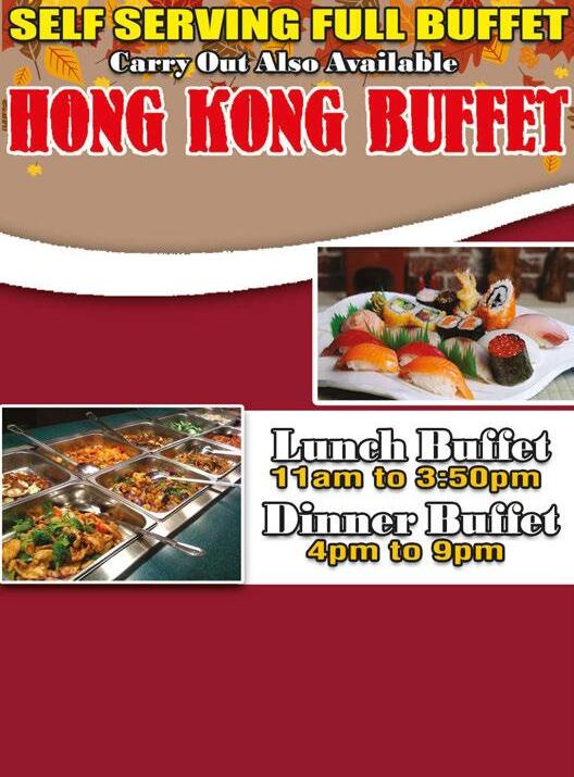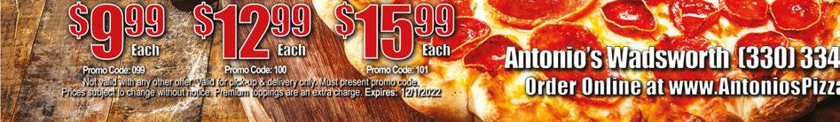 SUSHI • HIBACHI • LOUNGE 247 Great Oaks Trail • adswor th, OH 44281 el: 30-334-5888 47 Wadswor 330-334-5888 Valid only with coupons. Not valid with any other offers, specials or coupons. Coupons cannot be combined. Expires 12/1/22. $300 OFF Two Reg. Dinner Buffets Valid only with coupons. Not valid with any other offers, specials or coupons. Coupons cannot be combined. Expires 12/1/22. $100 OFF Two Reg. Lunch Buffets ORDER ONLINE FOR PICKUP www.hongkongbuffet5888.com CLOSED THANKSGIVING MON 4P-12A • TUE, WED, THUR 11AM-12A • FRI & SAT 11A-2A OPENING FOR LUNCH TUE-SAT 11A $5.00 OFF $30 or More Valid with coupon. Not valid with any other offer. Expires 12/1/22 opening Sundays at noon for NFL Games with the sunday ticket NFL FOOTBALL BEER & $1 WINGS SUNDAYS ARE BACK! $1 ea Traditional Wings $2.50 Domestic Bottles $12 Domestic Buckets (5) $3 16oz Domestic Draft live bands every Saturday dj on Friday karaoke on Thursday Valid with coupon. Not valid with any other offer. Expires 12/1/22 Buy One Lunch at Reg Menu Price & Get the 2nd Lunch 1/2 OFF (Equal or Lesser Value) 997 High St • Wadsworth 234.281.5363 taichifootspas.com Hours: Mon-Sat 10am-8pm Sun 11am-6pm Foot Re exology Improves Circulation Nerve Supply to your Feet! Helps the Body Achieve Balance Gift Certi cates Available Buy Five 1 Hour Gift Cards & Receive a 30 Minute Gift Card Buy Ten 1 Hour Gift Cards & Receive a 80 Minute Gift Card 30 Minutes $35 (reg. $40) 45 Minutes $40 (reg. $50) 60 Minutes $50 (reg. $70)
