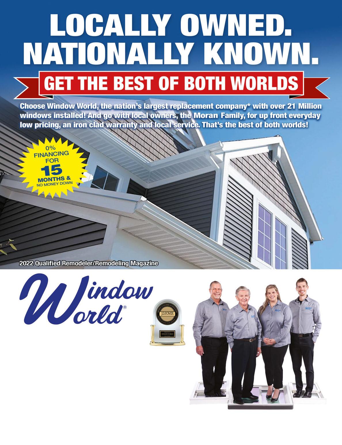 • America’s Largest Exterior Remodeler • Over 21 Million Windows Sold since 1995 FOR FREE IN HOME ESTIMATE, CALL 888-918-0508 VISIT OUR SHOWROOM 2424 Gilchrist Road, Akron www.WindowWorldAkron.com Serving All Akron/Canton Areas Pat Moran Fred Moran Mandi Fluck Patrick Moran WINDOWS • DOORS • MORE Pittsburgh • Cleveland • Akron • Youngstown • Toledo • Steubenville / Wheeling 6 Premium Windows Installed $3,405 or $73/month for 60 months Upgrade to Triple Pane for $6 more/month White Double Hung Windows in any size up to 4’ x 6’. Includes Solazone Insulated Glass. With approved credit. Low 9.99% APR. Exterior trim additional if needed. See store for details. Cannot combine offers. This Window World® Franchise is independently owned and operated by Window World Penn-Ohio under license from Window World, Inc. Ranked #1 For six out the last nine years, WIndow World was ranked number one in customer satisfaction, receiving the highest score in the retailer segment of the J.D. Power 2022 US Windows and Patio Doors Satisfaction Study