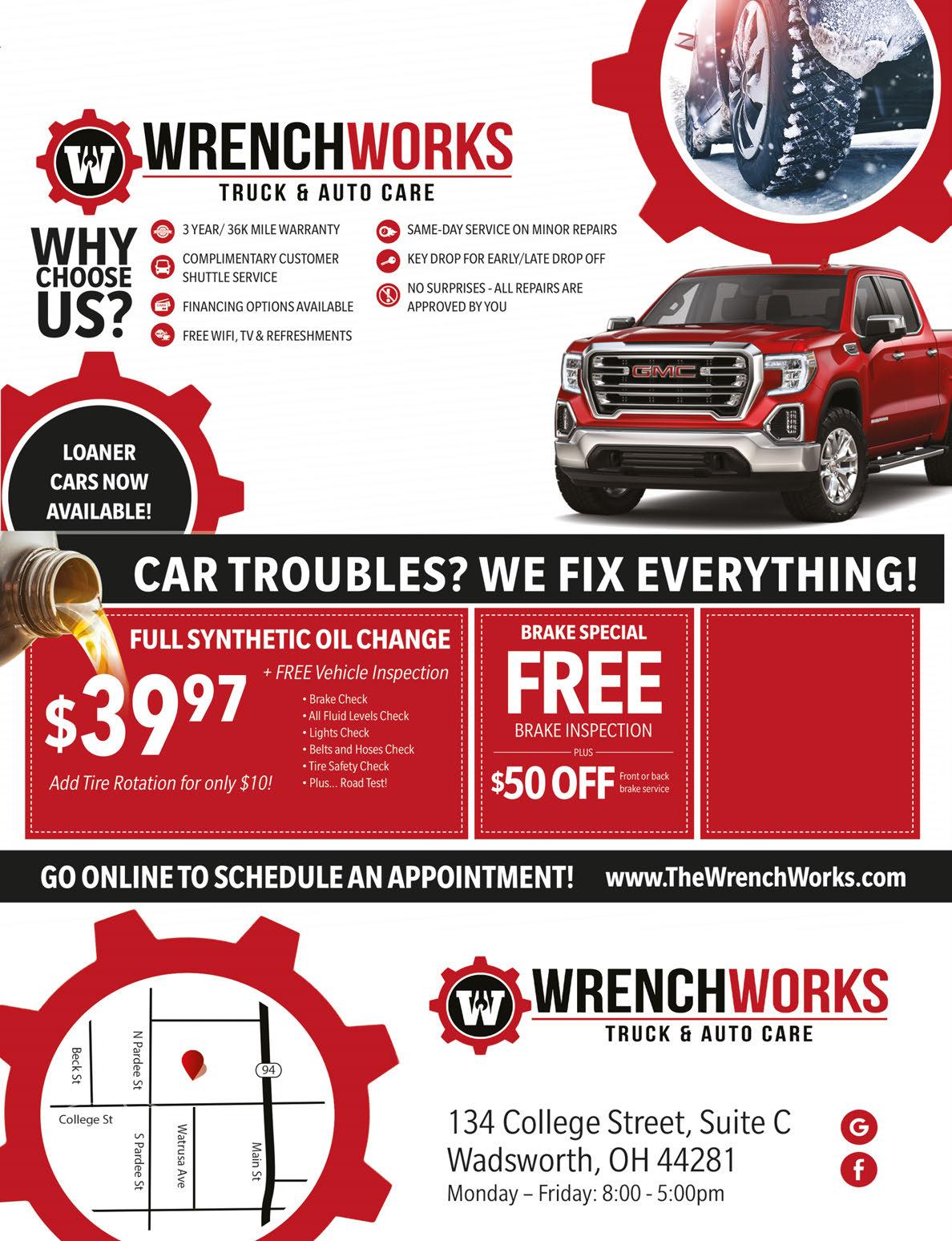 COMPLETE AUTO REPAIR / BODY SHOP / USED CAR SALES 350 Water St • Wadsworth • 330-336-6104 We sanitize your vehicle with any service ALL INSURANCE CLAIMS WELCOME Ask us How we can SAVE YOU MONEY on Your Deductible! Valid with coupon. Not valid with any other offer. Expires 12/1/22 Valid with coupon. Not valid with any other offer. Expires 12/1/22 Valid with coupon. Not valid with any other offer. Expires 12/1/22 LUBE, OIL & FILTER CHANGE – PLUSFREE VEHICLE INSPECTION $3495 semi-synthetic up to 5 qts & filter 4 WHEEL ALIGNMENT AND TIRE ROTATION & BALANCE $8995 SPRAY IN TRUCK BED LINER $64995 Present coupon with incoming order. Not valid with suedes, leathers, furs, alterations, wedding dresses, household items, or drapes. Not valid with any other coupon or specials. Expires 11/30/22. 20% HOUSEHOLDS Present coupon with incoming order. Not valid with any other coupon or specials. Expires 11/30/22. Present coupon with incoming order. Not valid with any other coupon or specials. Expires 11/30/22. Present coupon with incoming order. Not valid with suedes, leathers, furs, alterations, wedding dresses, household items, or drapes. Not valid with any other coupon or specials. Expires 11/30/22. Present coupon with incoming order. Not valid with any other coupon or specials. Expires 11/30/22. $249 SHIRTS NO LIMIT $200 off $300 off Bedspreads, Comforters, Drapes, Blankets, etc. $249 Laundered Standard Shirt on Hanger Laundered Standard Shirt on Hanger SHIRTS NO LIMIT $200 off Any $10 Dry-Cleaning Order Any $15 Dry-Cleaning Order Any $10 Dry-Cleaning Order Present coupon with incoming order. Not valid with suedes, leathers, furs, alterations, wedding dresses, household items, or drapes. Not valid with any other coupon or specials. Expires 11/30/22. Your First Pick Up & Delivery Order Upon Sign Up $1000 Off Present coupon with incoming order. Not valid with any other coupon or specials. Expires 11/30/22. Present coupon with incoming order. Not valid with any other coupon or specials. Expires 11/30/22. Bring in 3 but Only Pay for 2 SWEATERS Present coupon with incoming order. Not valid with any other coupon or specials. Expires 11/30/22. NOW HIRING!
