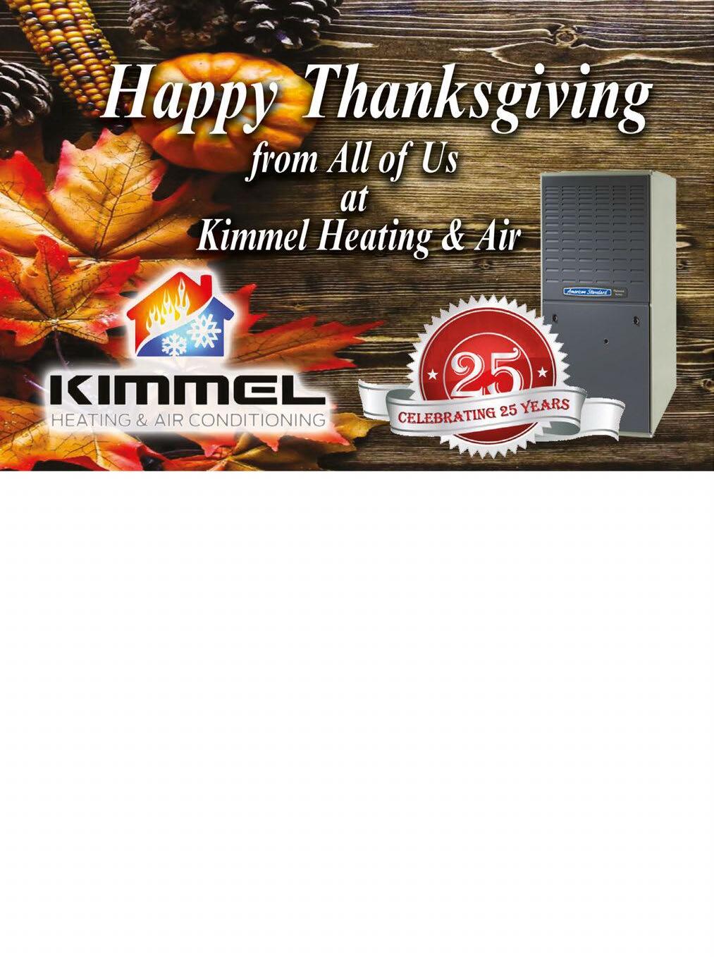 234-266-0088 License #15945 24 HOUR EMERGENCY SERVICE We Service All Makes & Models FURNACES – AIR CONDITIONERS – HUMIDIFIERS – HOT WATER TANKS – TANKLESS WATER HEATERS – HEAT PUMPS –AIR HANDLERS –BOILERS –TANKLESS BOILERS –THERMOSTATS –FILTERS –DIAGNOSTIC REPAIRS –WHOLE HOME AIR PURIFIERS –DUCT WORK – UV LIGHTS – MAINTENANCE PLANS – 24 HOUR EMERGENCY SERVICE – LOCAL FAMILY OWNED BUSINESSIN –25 YEARS IN BUSINESSFURNACES –AIR CONDITIONERS –HUMIDIFIERS –HOT WATER TANKS –TANKLESS WATER HEATERS –HEAT PUMPSFinancing Available* *Subject to credit approval, see store for details. www.kimmelheatingandair.com Residential, Commercial & New Construction Service Installation & Maintenance W Valid only during normal business hours. Cannot be combined with other offers. No additional discounts. Terms and conditions apply. Expires 12/1/2022 W Gas/Propane furnaces only, does not include boiler/oil furnaces. Valid only during normal business hours. Cannot be combined with other offers. No additional discounts. Terms and conditions apply. Expires 12/1/2022 $99 Tune & Check (regularly $129.00) $20 OFF New Customer $50 OFF Duct Cleaning & Tune Up (per furnace) W Valid only during normal business hours. Cannot be combined with other offers. No additional discounts. Terms and conditions apply. Expires 12/1/2022