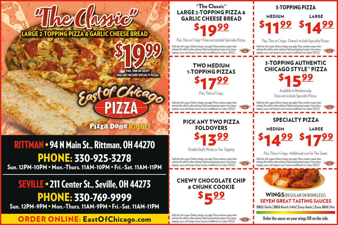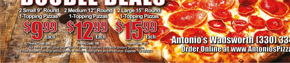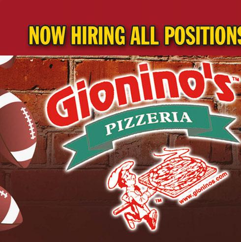 330-334-9191 • www.gioninos.com 138 Akron Rd. • Wadsworth • (Serving Wadsworth & Sharon Twp.-up to Rt. 18) Delivery Available • $10 Minimum Order • Limited Area GIONINO’S PIZZERIA Coupon expires 9-1-2022. Not valid with any other offer. Valid only at Wadsworth location. TMS GIONINO’S PIZZERIA Coupon expires 9-29-2022. Not valid with any other offer. Valid only at Wadsworth location. TMS GIONINO’S PIZZERIA Coupon expires 9-1-2022. Not valid with any other offer. Valid only at Wadsworth location. TMS GIONINO’S PIZZERIA Coupon expires 9-29-2022. Not valid with any other offer. Valid only at Wadsworth location. TMS GIONINO’S PIZZERIA Coupon expires 9-29-2022. Not valid with any other offer. Valid only at Wadsworth location. TMS GIONINO’S PIZZERIA Coupon expires 9-29-2022. Not valid with any other offer. Valid only at Wadsworth location. TMS GIONINO’S PIZZERIA (Excludes Steak) Coupon expires 9-29-2022. Not valid with any other offer. Valid only at Wadsworth location. TMS GIONINO’S PIZZERIA Coupon expires 9-29-2022. Not valid with any other offer. Valid only at Wadsworth location. TMS GIONINO’S PIZZERIA Coupon expires 9-1-2022. Not valid with any other offer. Valid only at Wadsworth location. TMS GIONINO’S PIZZERIA Coupon expires 9-29-2022. Not valid with any other offer. Valid only at Wadsworth location. TMS GIONINO’S PIZZERIA Coupon expires 9-29-2022. Not valid with any other offer. Valid only at Wadsworth location. TMS GIONINO’S PIZZERIA Coupon expires 9-1-2022. Not valid with any other offer. Valid only at Wadsworth location. TMS FREE Small Cheese Pizza with Purchase of A Large Specialty Pizza Large 16” 2-Item Pizza Only $1795 Medium 12” Pizza With 2-Items Only $1195 Large 16” 1-Item Pizza, 12 Wings (Jumbo Reg. or Boneless) Only $2995 Any 2 Subs Only $1500 2 Medium 12” Pizzas With 1-Item Each Only $2095 Add a pint of cole slaw for $1.95 Large 16” 1-Item Pizza Only $1595 2 Large 16” Pizzas With 1-Item Each Only $3195 Grizzly Feast Large 16” 2-Item Pizza & 12pc. Chicken & JoJo’s Only $3895 Add a pint of cole slaw for $2.50 No Substitutions Mixed or All Dark Junior Grizzly Feast Medium 12” 2-Item Pizza & 8pc. Chicken & JoJo’s Only $2995 Add a pint of cole slaw for $2.50 No Substitutions Mixed or All Dark Sheet 1-Item Pizza Only $2595 24 hr. Notice GIONINO’S PIZZERIA Coupon expires 9-29-2022. Not valid with any other offer. Valid only at Wadsworth location. TMS GIONINO’S PIZZERIA Coupon expires 9-29-2022. Not valid with any other offer. Valid only at Wadsworth location. TMS Lunch Special 11am to 3pm Medium 1-Item Pizza Only $1000 (Pick-up Only) Open For Delivery or Pick-Up Chicken Special 12 Mixed Chicken with JoJo’s Only $2095 Wing Special Large 16” 1-Item Pizza & a Box of JoJo’s Only $2395 No Substitutions Add a Pint of Cole Slaw for $250 GIONINO’S PIZZERIA Coupon expires 9-29-2022. Not valid with any other offer. Valid only at Wadsworth location. TMS GIONINO’S PIZZERIA Coupon expires 9-29-2022. Not valid with any other offer. Valid only at Wadsworth location. TMS $2900 24 Boneless $2200 No Substitutions GIONINO’S PIZZERIA Coupon expires 9-29-2022. Not valid with any other offer. Valid only at Wadsworth location. TMS $3295 Weekend Special WELCOME BACK FOOTBALL Large 1-Item Pizza Large Tossed Salad & Dozen Boneless or Jumbo Reg. Wings 2022 FOOTBALL SCHEDULES Sept. 11 at Carolina Sept. 18 NY Jets Sept. 22 Pittsburgh BROWNS OHIO STATE Sept. 3 Notre Dame Sept. 17 Arkansas St. Sept. 24 Wisconsin Open Labor Day Catering Special $1000 OFF $100 or more on regular menu items