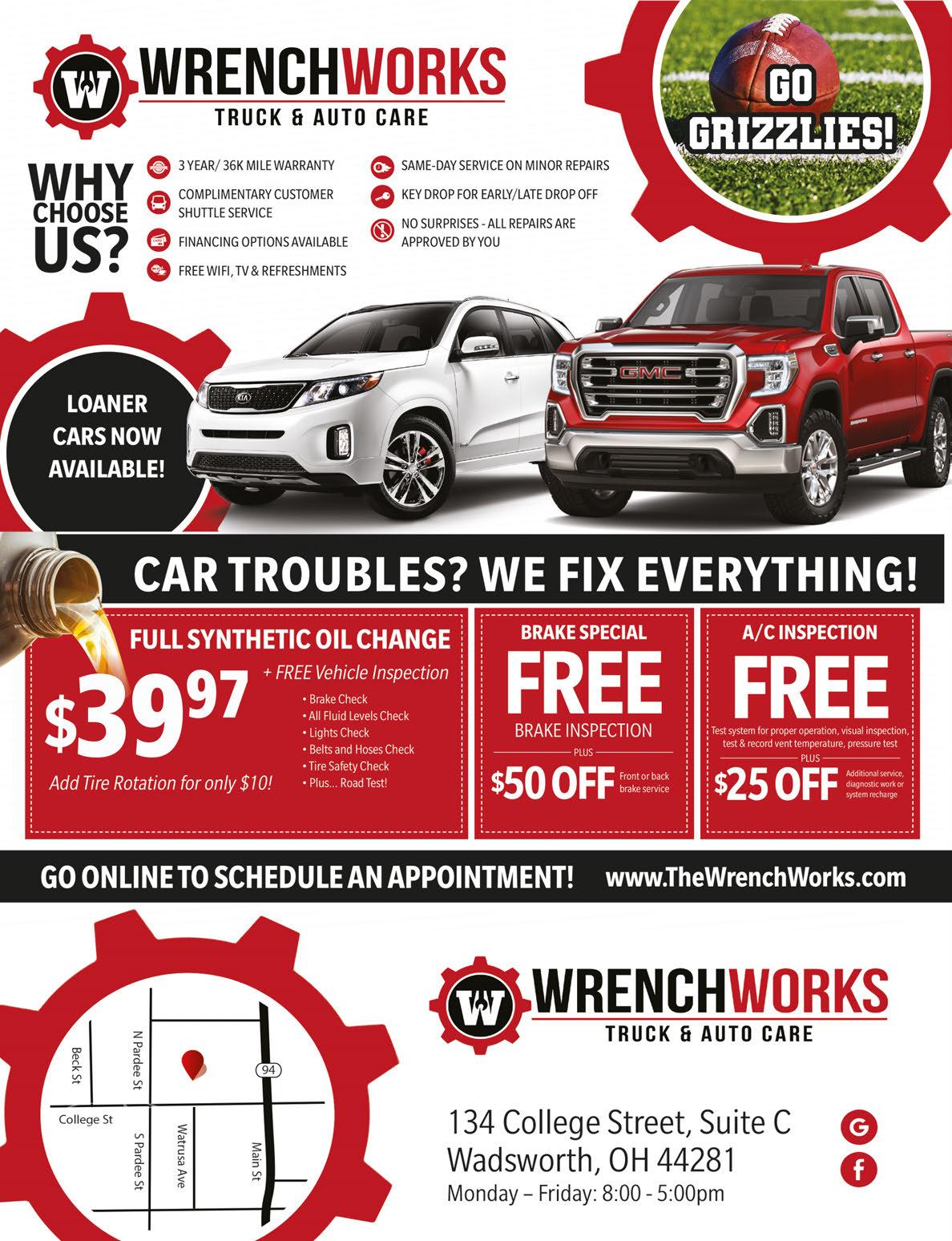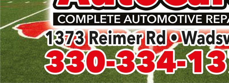 NOW HIRING! COMPLETE AUTO REPAIR / BODY SHOP / USED CAR SALES 350 Water St • Wadsworth • 330-336-6104 We sanitize your vehicle with any service ALL INSURANCE CLAIMS WELCOME Ask us How we can SAVE YOU MONEY on Your Deductible! AIR CONDITIONER SERVICE $6995 Includes Evacuate & Recharge System & Check for Leaks & System Performance Freon Extra Valid with coupon. Not valid with any other offer. Expires 9/29/22 Valid with coupon. Not valid with any other offer. Expires 9/29/22 Valid with coupon. Not valid with any other offer. Expires 9/29/22 LUBE, OIL & FILTER CHANGE – PLUSFREE VEHICLE INSPECTION $3295 semi-synthetic up to 5 qts & filter 4 WHEEL ALIGNMENT AND TIRE ROTATION & BALANCE $8995
