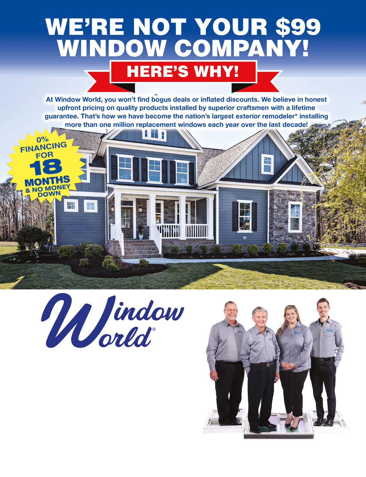 • America’s Largest Exterior Remodeler • Over 20 Million Windows Sold since 1995 FOR FREE IN HOME ESTIMATE, CALL 888-918-0508 VISIT OUR SHOWROOM 2424 Gilchrist Road, Akron www.WindowWorldAkron.com Serving All Akron/Canton Areas This Window World® Franchise is independently owned and operated by Window World Penn-Ohio under license from Window World, Inc. Pat Moran Fred Moran Mandi Fluck Patrick Moran WINDOWS • DOORS • MORE Pittsburgh • Cleveland • Akron • Youngstown • Toledo • Steubenville / Wheeling *2021 Qualified Remodeler / Remodeling Magazine 6 Premium Windows Installed $3,405 or $73/month for 60 months Upgrade to Triple Pane for $6 more/month White Double Hung Windows in any size up to 4’ x 6’. Includes Solazone Insulated Glass. With approved credit. Low 9.99% APR. Exterior trim additional if needed. See store for details. Cannot combine offers.