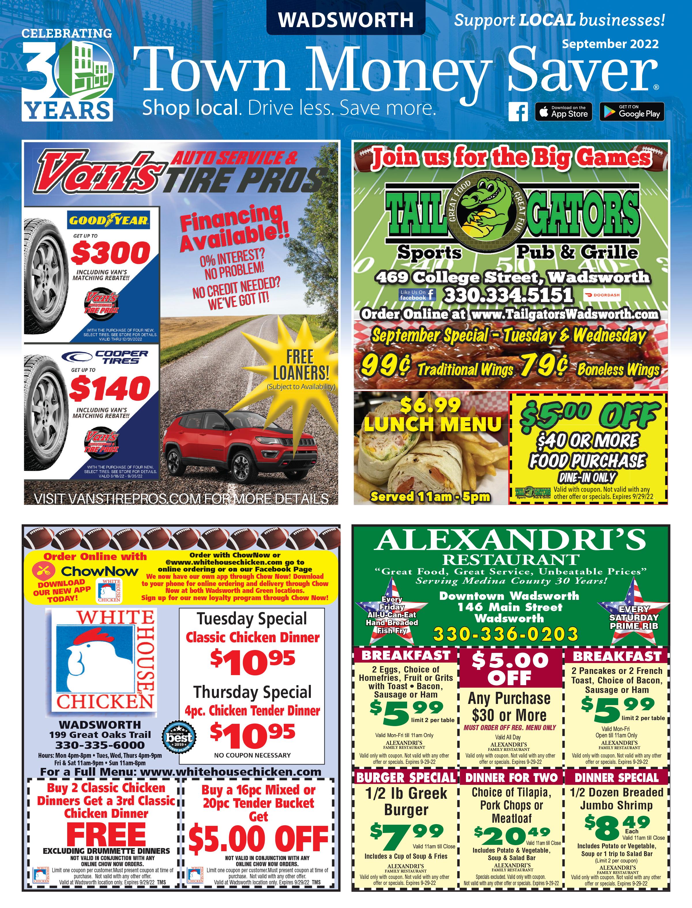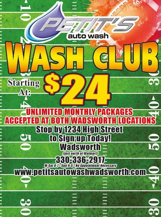 …by saving your customers money. Shop locally. Save locally. Be a hero to your current customers and attract new business by placing an ad with SUPER SAVINGS in Town Money Saver. ADVERTISE TODAY! Contact Laura to get started. 330.350.2089 lgrozan@townmoneysaver.com $4 OFF ULTIMATE HOT WAX OR WORKS WASH 1234 High Street location.Not valid with any other offers. Expires 9/30/22 Must Present Coupon. Not Valid With Any Other Offer. 1234 High St, Wadsworth. Expires 9/30/22 $5 OFF ANY OIL CHANGE www.facebook.com/Petitsautowashandlube FREE VACS FROM 8AM-8PM WADSWORTH’S TOUCH-ONLYFREE AUTO WASH!