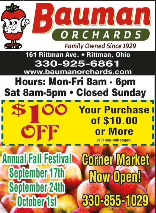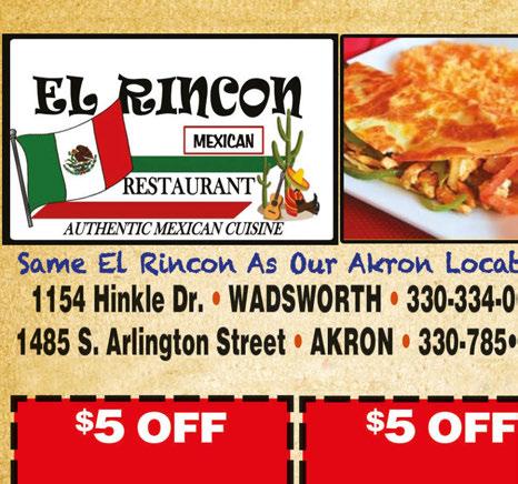 ® www.greatoaksstorage.com Great Oaks Shopping Plaza • 209 Great Oaks Trail A short walk from Buehler’s Wadsworth • Conveniently located just off of I-76 Call (330) 334-0545 or (216) 696-5442 CLEAN & SECURE! * 24 Hr. Video Surveillance Cameras * All Indoor & Climate Controlled * Personal Entry Codes (Access 7am-7pm) * Month-to-Month Rental * Long-Term Leasing Discounts RESIDENTIAL • COMMERCIAL • STUDENTS WELCOME! $25.00 OFF FIRST MONTH’S RENT GREAT OAKS MINI STORAGE • PARTIAL MONTH EXCLUDED. WITH THIS COUPON. NOT VALID WITH OTHER OFFERS. EXPIRES 9-29-22 STORE THEIR STUFF! CLAIM BACK YOUR COLLEGE KID’S ROOM! BACK-TO-SCHOOL SPECIAL! DAILY SPECIALS Tuesday $2.00 Hamburgers $2.00 Tacos or 3 for $5 $2.50 Cheeseburgers Wednesday 99¢ Wings $7.99 Gyro & Fries $2.50 1/4 lb Hot Dogs Thursday $2.50 Hot Dogs 99¢ Wings Chicken Buffet $12.00 Includes 2 Meat Buffet (Chicken Plus a 2nd Meat) Plus a Dessert Friday 3 Pc. Fish Dinner $10.99 Homemade Soups Everyday $3.00 OFF PURCHASE OF $20 OR MORE Valid with coupon. Not Valid with any other offer. Expires 9/29/22 Booking Parties for 2022 / 2023 for Banquet Hall (call for details) Join Us on the Patio!