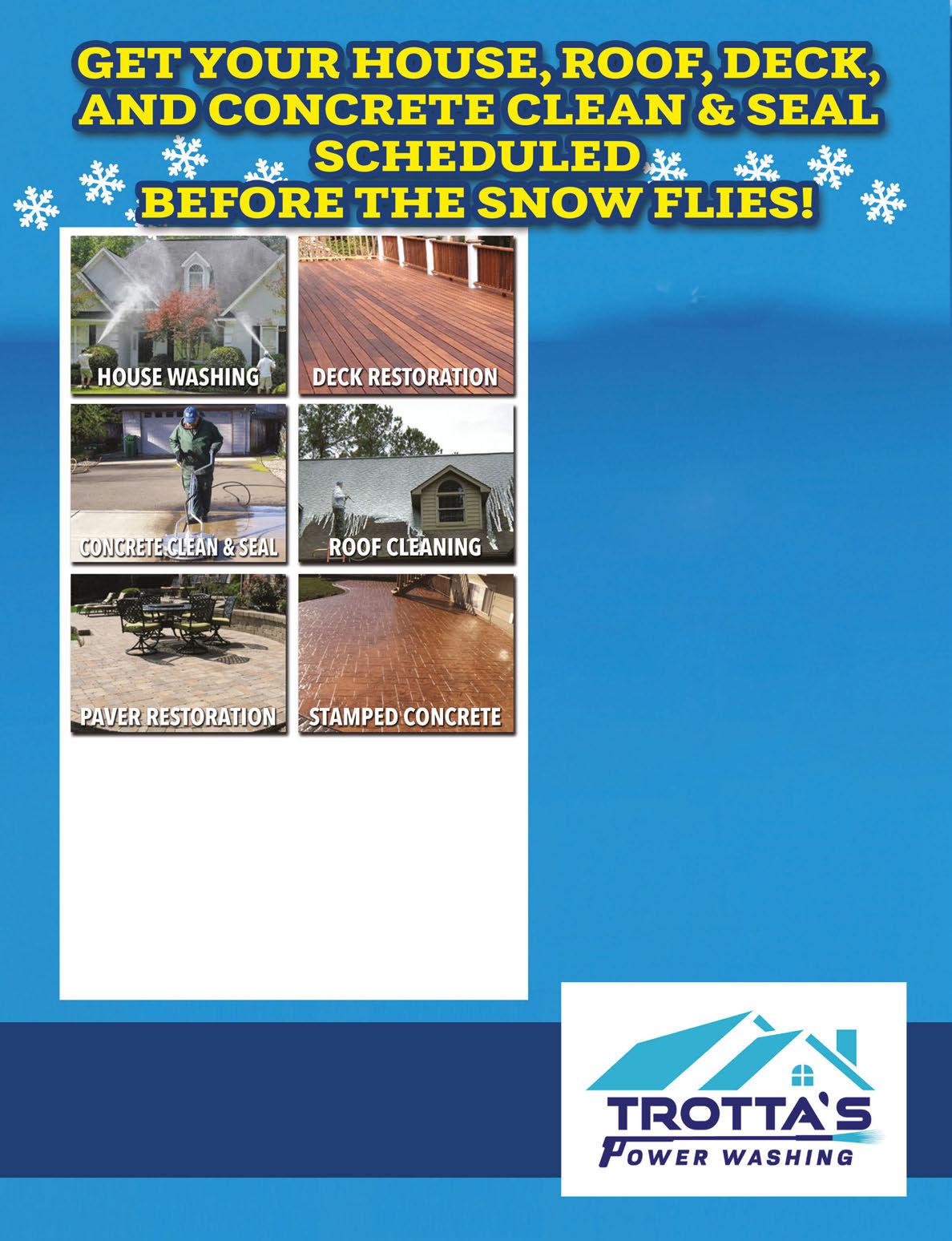 Home of the “Trotta Soft Wash” HOME DETAIL WOOD RESTORATION CONCRETE/PAVER RESTORATION INTERIOR/EXTERIOR PAINTING • Siding Cleaned • Gutter Whitening • Roof Cleaning • SAFE MILDEW REMOVAL • 2 Year Full Warranty • Decks Washed & Sealed • Fences • 2 Year Full Warranty • Deck Stripping • Driveway Clean & Seal • Stamped Concrete Sealing • Patio / Brick Pavers (Resanding Joints) • Decks • Wood Siding Refinishing • Fully Insured Valid only with coupon. Not valid with any other offers. (330) 422-4097 trottaspowerwashing.com Free Estimates 20% OFF CONCRETE CLEAN/SEAL Valid only with coupon. Not valid with any other offers. COMPLIMENTARY TRASH CAN CLEANING WITH ANY HOUSE WASH PURCHASE