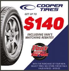 185/65R15 195/60R15 195/60R15 195/65R15 215/70R15 235/75R15 205/55R16 205/55R16 205/60R16 205/65R16 205/70R16 215/55R16 215/60R16 215/60R16 215/65R16 225/60R16 225/65R16 235/70R16 LT245/75R16 215/55R17 215/60R17 225/50R17 225/55R17 225/60R17 225/65R17 225/65R17 225/65R17 235/50R17 65K 55K 50K 55K 50K 50K 55K 50K 55K 65K 70K 55K 55K 65K 65K 55K 65K 55K 50K 55K 65K 65K 55K 55K 55K 65K 80K 40K $65 $70 $80 $70 $75 $85 $85 $95 $80 $95 $100 $95 $90 $100 $95 $90 $100 $110 $150 $95 $115 $110 $100 $95 $100 $125 $135 $100 55K 55K 50K 50K 60K 55K 50K 50K 50K 65K 55K 50K 50K 70K 50K 50K 60K 60K 60K 50K 50K 70K 50K 55K 70K 55K 60K 50K $100 $120 $140 $125 $150 $125 $110 $125 $115 $120 $130 $125 $130 $150 $150 $150 $170 $185 $175 $200 $135 $150 $185 $150 $175 $160 $170 $165 TireSizeBrandMileagePriceEach* TireSizeBrandMileagePriceEach* *Pricesarepertireanddoesnotincludeinstallation. Thesepricesvalidthrough8/31/22.**Plustaxes&fees. AKRON 330-724-7400 449EWATERLOORD CUYAHOGAFALLS 330-794-5263 4005STATERD MEDINA 330-239-2371 1451MEDINARD AKRON 330-784-5454 1725EMarket WOOSTER 330-262-6800 210SBUCKEYEST ELLET 330-784-7740 682CANTONRD MANSFIELD 419-529-0865 801LEXINGTONAVE NORWALK 419-677-0655 2874STATERT61 WADSWORTH 330-336-6630 185BROADST NRIDGEVILLE 440-327-7010 37775CENTERRIDGERD PARMA 440-663-3600 7701DAYDRIVE IBERIA 419-468-1777 3596STATERT309 oes not include installation FREE FREE LOANERS! LOANERS! (SubjecttoAvailability) (SubjecttoAvailability) CHECK US OUT AT ONE OF OUR 12 CONVENIENT LOCATIONS! CHECKUSOUTATONEOFOUR12CONVENIENTLOCATIONS!