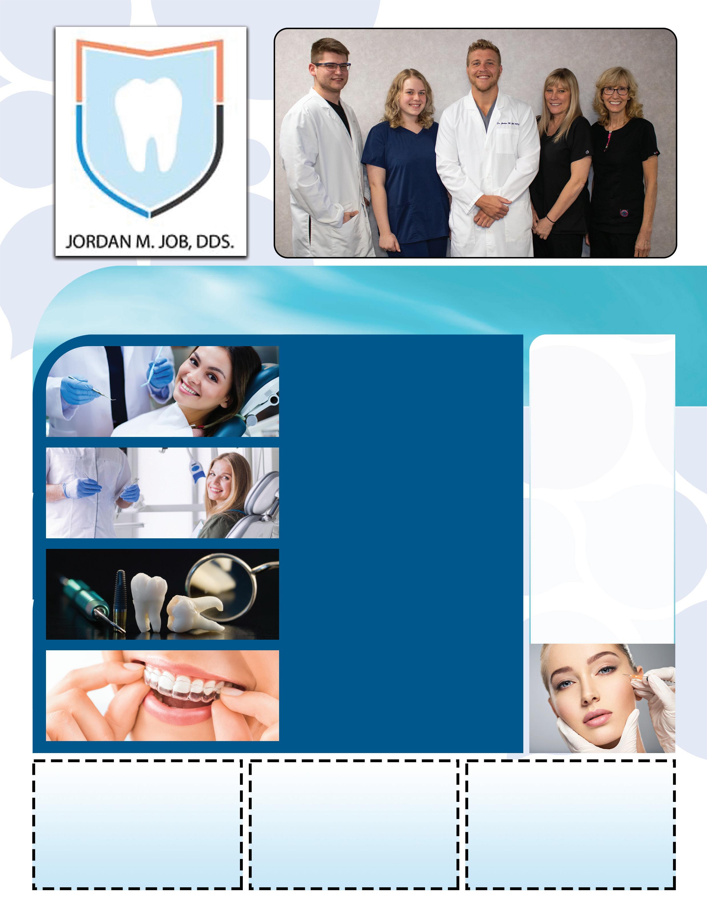 Hygiene Dentistry Thorough teeth cleanings with our hygienist every six months ensure your smile stays healthy! Dental Crowns Our porcelain dental crowns protect broken teeth and blend seamlessly with your beautiful smile. Dental Implants Dental implants are tooth replacements that look, feel, and function most like natural teeth. ClearCorrect/Invisalign Aligners Thanks to ClearCorrect/Invisalign, you can get the beautiful straight smile you want without metal braces! 7862 Broadview Rd, Parma , OH 44134 (located in same plaza as Two Bucks & Jets Pizza) 440-888-5855 • jobddsdental.com We Accept Most Insurance! Here’s what our satisfied patients are saying... “Honestly the best experience going to the dentist every time I have to go! Can’t speak any higher of you guys!” Janel N - 3/15/2022 “Friendly hygienists! Quick, and effective. Awesome experience!” Cole Van N - 1/31/2022 Mention TMS when scheduling service. Not valid with any other offer. Expires 9/1/22 Mention TMS when scheduling service. Not valid with any other offer. Expires 9/1/22 Mention TMS when scheduling service. Not valid with any other offer. Expires 9/1/22 New Patient Special 50% OFF Your First Cleaning 25% OFF In Office or Take Home Whitening Free Consult With Coupon Freshen Up for Summer! Botox & Dermal Fillers