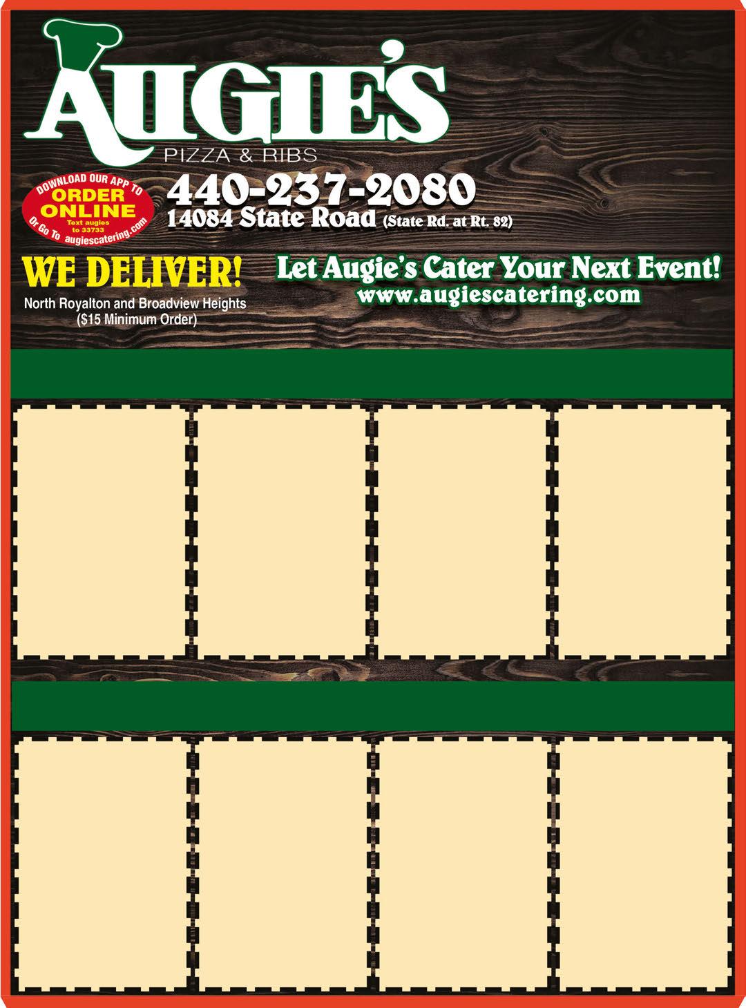 Prices May Vary Due to Rising Costs. PARTY PLEASERS $9599 • 40 Pieces of Fried, BBQ, Italian Or Honey Roasted Chicken • Plus 1 Full Sheet $14995 • 40 Pieces of Fried, BBQ, Italian Or Honey Roasted Chicken • 1 Full Sheet Cheese Pizza • Plus Full Pan of Rigatoni $19995 • 40 Pieces of Fried, BBQ, Italian Or Honey Roasted Chicken • 1 Full Sheet Cheese Pizza • Full Pan of Rigatoni Marinara • Plus Full Pan of Dinner Salad with Dressing $36995 • 80 Pieces of Fried, BBQ,Italian Or Honey Roasted Chicken • 2 Full Sheet Cheese Pizzas • Full Pan of Rigatoni Marinara • Full Pan of Meatballs or Sausage & Peppers • Full Pan of Dinner Salad with Dressing $5.00 OFF $3295 2 MEDIUM 1-TOPPING* PIZZAS $2495 code: 2mdsale Not valid with any catering menu item. One coupon per order. Not valid with any other offer, coupon or special. Pick up or delivery only. Coupon must be presented/mention at time of order. Limited Time Offer. Any Order of $30 or More code: 5discount 2 LARGE 1-REGULAR TOPPING PIZZAS Online code: 2lgsale One coupon per order. Not valid with any other offer, coupon or special. Pick up or delivery only. Coupon must be presented/mention at time of order. Limited Time Offer. Not valid with any other coupon or special. Carryout and delivery only. No substitutions. Not valid with any other coupon or special. Carryout and delivery only. No substitutions. Not valid with any other coupon or special. Carryout and delivery only. No substitutions. Not valid with any other coupon or special. Carryout and delivery only. No substitutions. EVERYDAY COUPONS One coupon per order. Not valid with any other offer, coupon or special. Pick up or delivery only. Coupon must be presented/mention at time of order. Limited Time Offer. LARGE 3-REGULAR TOPPING PIZZA $2195 code: large3topping One coupon per order. Not valid with any other offer, coupon or special. Pick up or delivery only. Coupon must be presented/mention at time of order. Limited Time Offer. PRICES ARE SUBJECT TO CHANGE PRICES ARE SUBJECT TO CHANGE SPORTS SPECIAL 1 Large Regular Topping Pizza, 10 Bone-In Wings & 1 Free 2-Liter of Coke $3195 Not valid with any catering menu item. One coupon per order. Not valid with any other offer, coupon or special. Pick up or delivery only. Coupon must be presented/mention at time of order. Limited Time Offer. 48 Hour Notice Required