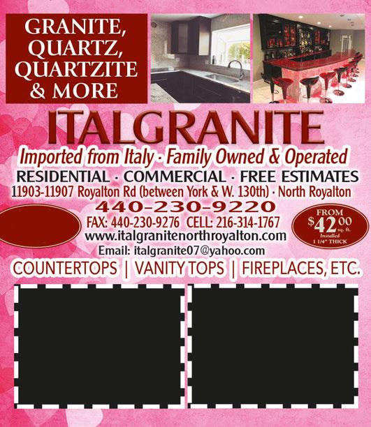 BRECKSVILLE • BROADVIEW HEIGHTS Published By Town Money Saver, Inc. Corporate Office • PO Box 356 • Lucas, OH 44843 © 2023 TMS Franchising, Inc. All rights reserved. For advertising information, call 330-802-0290 NEXT ISSUE IN HOMES: March 2, 2023 ADVERTISING DEADLINE: February 15, 2023 PRSRT STD ECRWSS U.S. POSTAGE PAID Town Money Saver, Inc. townmoneysaver.com Open: Mon-Fri 8am-6pm Saturday 9am-2pm FREE STAINLESS STEEL SINK with purchase of granite or quartz Kitchen countertop 45 sq. ft. or more Valid only with coupon. Not valid with any other coupons or discounts. Expires 3/2/23 FREE REMNANT PIECE FOR BATHROOM VANITY with purchase of granite or quartz Kitchen countertop 75 sq. ft. or more Valid only with coupon. Not valid with any other coupons or discounts. Expires 3/2/23 QUICK INSTALLATION - 2 WEEKS OR LESS FROM TEMPLATE FALL IN LOVE WITH YOUR KITCHEN THIS YEAR 4101 E. Royalton Road • BROADVIEW HTS 44147 bubbakoos.com “THE NASHVILLE HOT BURRITO” $5 OFF $30 OR MORE NOT VALID WITH ONLINE ORDERS. NOT VALID WITH ANY OTHER OFFER. MUST PRESENT THIS TMS COUPON. EXPIRES 3/2/23 VIEW OUR MENU NOT VALID WITH ONLINE ORDERS. NOT VALID WITH ANY OTHER OFFER. MUST PRESENT THIS TMS COUPON. EXPIRES 3/2/23 $2 OFF$15 11am-1pm LUNCH SPECIAL ANY COFFEE, TEA, ESPRESSO DRINK OR FOOD ITEM EXPIRES 3/2/23
