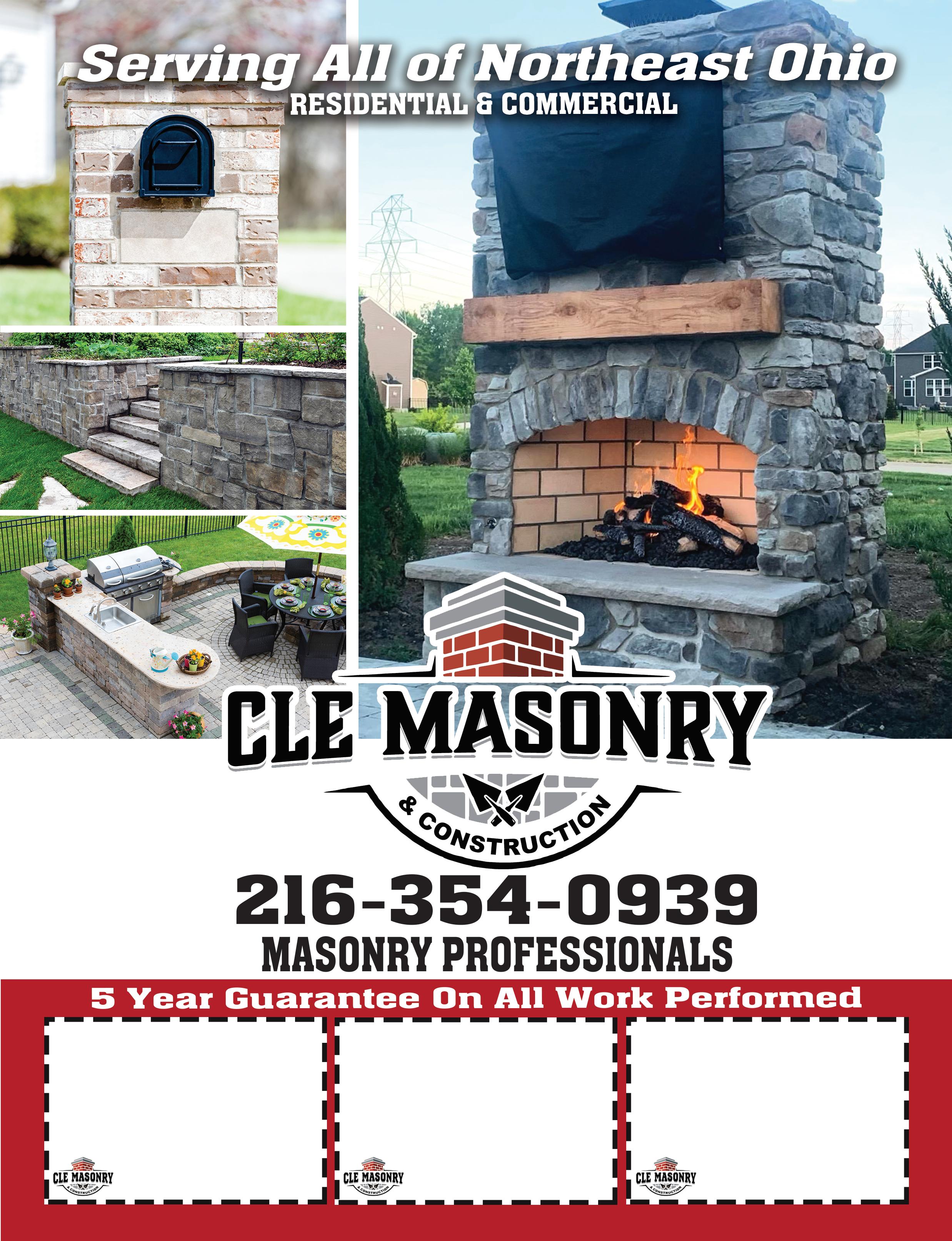 www.clemasonry.com Veteran Owned • CHIMNEY REPAIR • STEP REPAIR • TUCK POINTING • STONE VENEER • CONCRETE • FIREPLACES • RETAINING WALLS $250 OFF MASONRY WORK ON ANY JOB OVER $2500 With Coupon. With Coupon. With Coupon. FREE WATERPROOFING WITH ANY PURCHASE $50 OFF MASONRY WORK ON ANY JOB OVER $500 FREE ESTIMATES BONDED & INSURED