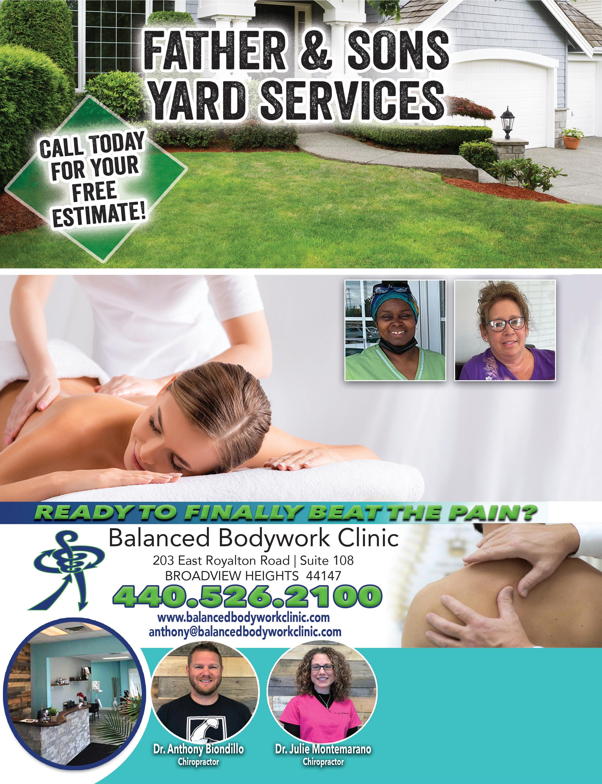 “I spent a week with lower back pain hoping it would go away. After 20 minutes with Dr. Julie I feel like a new man! have two more appointments scheduled to make sure its all ironed out, but love it and highly recommend Balanced Bodywork Clinic to anyone in pain!” - Tim Gulick March 14 2022 Phyllis Marie NEW CLIENT OFFER INTRODUCTORY 60 MINUTE MASSAGE $60 (reg. $70) Must present TMS coupon. Not valid with any other offer. Expires 7/31/22 • FLOWER BED MAKEOVERS • CLEAN UP • MOWING • TRIMMING • AND MORE! MULCH DELIVERY & INSTALLATION 440-539-2014 Reasonable Rates • Quality Work • Family Owned Massage Therapy Licensed Massage FREE With First Time Visit! ($15 Value) $100 OFF Landscaping projects $850 or more Must present TMS coupon. Not valid with any other offer. Expires 7/31/22