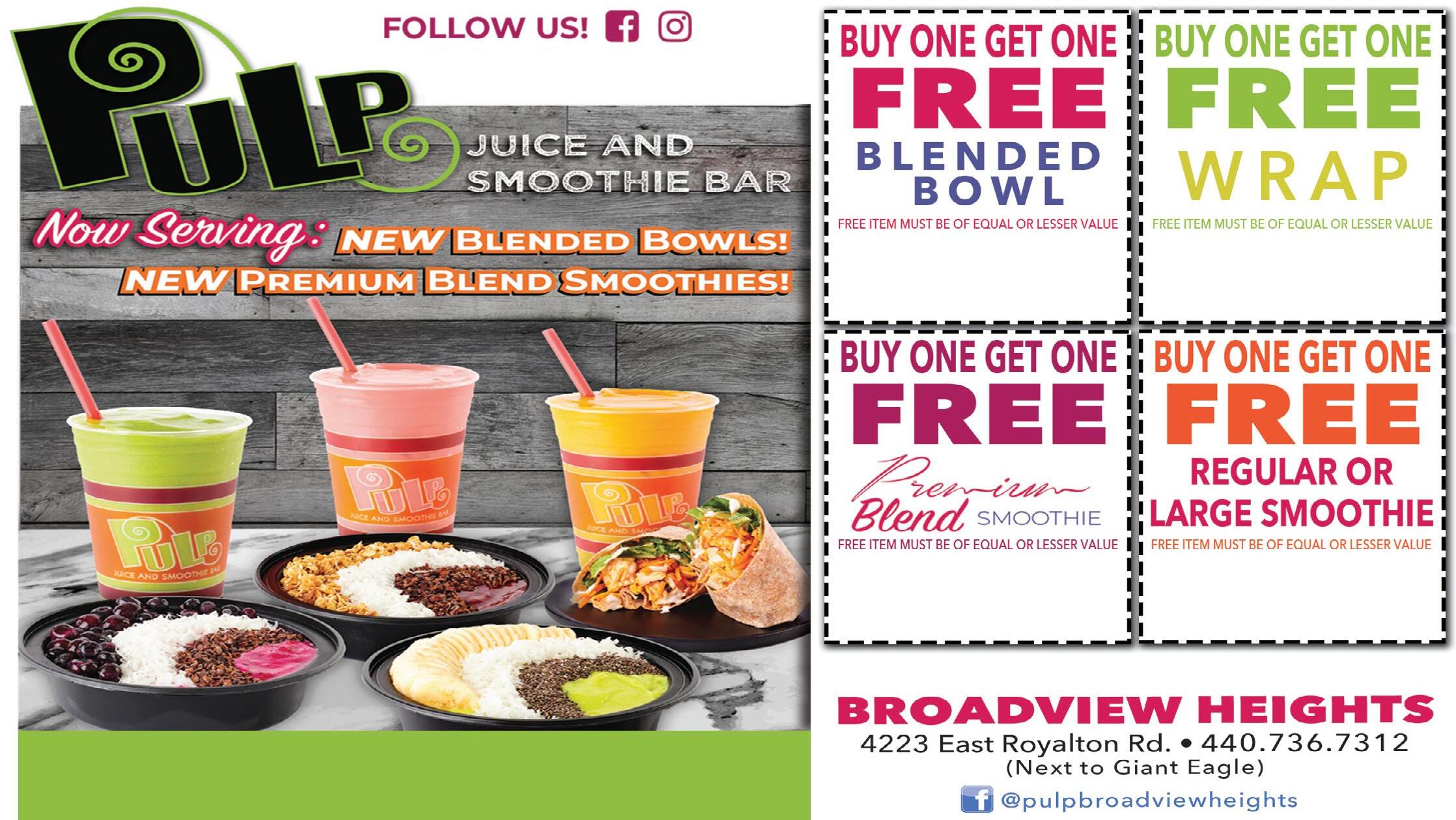 BRECKSVILLE • BROADVIEW HEIGHTS October 2022 Shop local. Drive less. Save more. 10/31/22 10/31/22 10/31/22 through dine in only dine in / togo dine in / togo BBH BBH BBH Dinner Only. Dinner Only. Dinner Only. PULPJUICEANDSMOOTHIE.COM Smoothies, Healthy Wraps, Salads, Fresh Fruit and Vegetable Juice, Nutritious Wheatgrass! Valid at Broadview Heights location only. One coupon per customer per visit. Offers cannot be combined. Must present coupon at time of purchase. Expires 10-31-2022 Valid at Broadview Heights location only. One coupon per customer per visit. Offers cannot be combined. Must present coupon at time of purchase. Expires 10-31-2022 Valid at Broadview Heights location only. One coupon per customer per visit. Offers cannot be combined. Must present coupon at time of purchase. Expires 10-31-2022 Valid at Broadview Heights location only. One coupon per customer per visit. Offers cannot be combined. Must present coupon at time of purchase. Expires 10-31-2022 We are open: Mon-Fri 6:30am-9:00pm • Sat-Sun 9:00am-9:00pm
