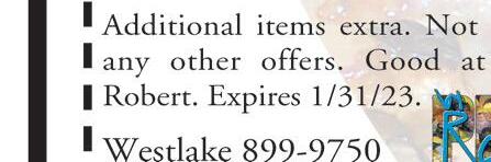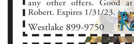 $400 OFF Any Purchase of $20 or More (Tax Not Included) Dine In Only. Valid at all locations listed. One coupon per table per party. Not valid w/any other offers or special of the day. Not valid on alcohol. Exp 1-19-23. $600 OFF Any Purchase of $30 or More (Tax Not Included) Dine In Only. Valid at all locations listed. One coupon per table per party. Not valid w/any other offers or special of the day. Not valid on alcohol. Exp 1-19-23. $1000 OFF Any Purchase of $50 or More (Tax Not Included) Dine In Only. Valid at all locations listed. One coupon per table per party. Not valid w/any other offers or special of the day. Not valid on alcohol. Exp 1-19-23. W W W Additional Parking in Rear N S Crocker Bradley Detroit RT 90 FREE WIFI Serving Liquor 7 Days a Week! Dine-In/Carryout Prepared Fresh Daily ONLINE ORDERING Visit donramon-granfiestamex.com for other locations & menu Visit donramon-granfiestamex.com for other locations & menu Don Ramon Mex Westlake Gift Certificates Available Westlake 30610 Detroit Rd. 440-835-6935 Restrictions May Apply. Offer valid thru 12/31/22 HOLIDAY GATHERING? CALL FOR A RESERVATION. Closed EveChristmas & Day Open New Year’s Eve & Day