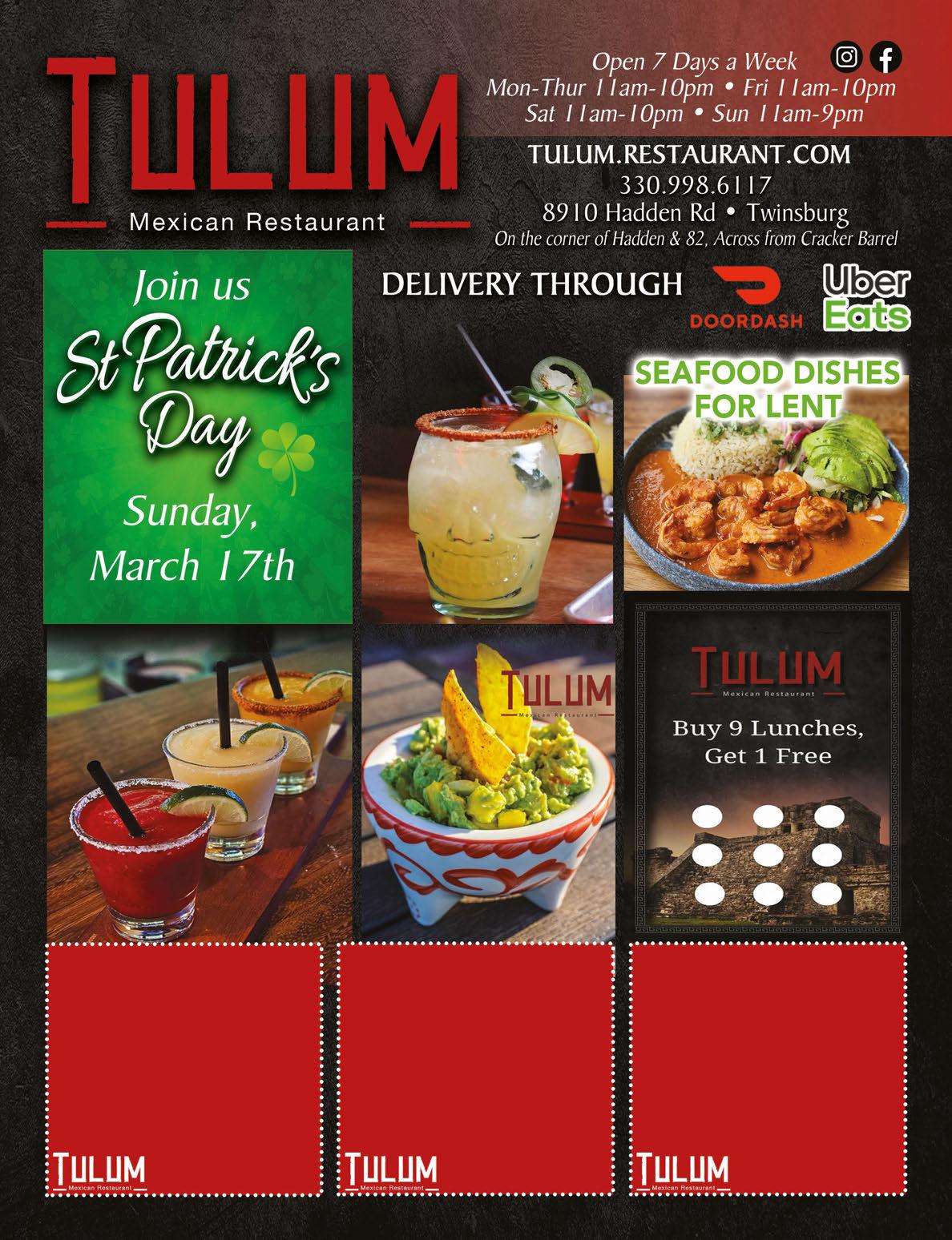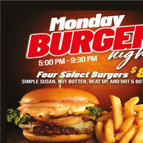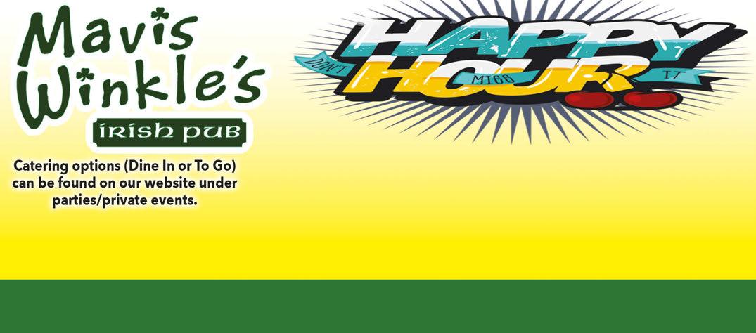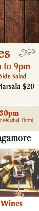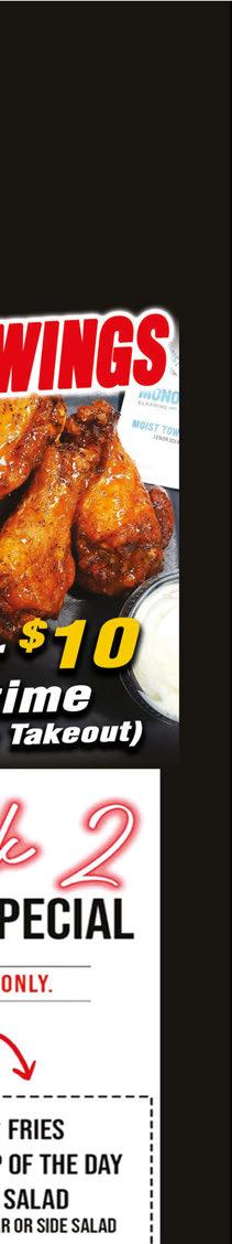 330-405-3663 • 8870 DARROW ROAD • TWINSBURG Order online @ maviswinkles.com • Follow us on FB @ maviswinkles for updates & Specials Monday through Saturday 3:30pm - 6:30pm Select 1/2 OFF Apps • $1 OFF Miller Lite Drafts $1 OFF All Glasses of Wine • $1 OFF Well Liquors $14 Bucket Domestic Bottles • *$1 Wings During Happy Hour (Dine In Only. During Happy Hour. No Doggy Bags. In Increments of 5) MONDAY THRU SATURDAY BURGER NIGHT 7pm - Close ALL BURGERS STARTING AT $10 Thursday Trivia starts @ 7pm WING & WINE WEDNESDAY 1/2 Off Select Bottles of Wine Discounted Wings Extended Happy Hour until 8pm. Karaoke starts @ 7pm Join Us For Lent Fish Fry & Seafood Entrées! CLOSED EASTER SUNDAY The Place to be for St. Patrick’s Day! Corned Beef Dinners, Corned Beef Sandwiches & Rueben’s Must present TMS coupon. Not valid with any other offer. One coupon per visit. Exp 4/15/24