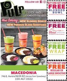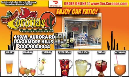 NORDONIA HILLS Shop local. Drive less. Save more. Support LOCAL businesses! September 2022 To advertise, call 330.802.0290 Smoothies, Healthy Wraps, Salads, Fresh Fruit and Vegetable Juice, Nutritious Wheatgrass! Valid at Macedonia location only. One coupon per customer per visit. Offers cannot be combined. Must present coupon at time of purchase. Expires 10-31-2022 Valid at Macedonia location only. One coupon per customer per visit. Offers cannot be combined. Must present coupon at time of purchase. Expires 10-31-2022 Not valid on Premium Smoothies. Valid at Macedonia location only. One coupon per customer per visit. Offers cannot be combined. Must present coupon at time of purchase. Expires 10-31-2022 Valid at Macedonia location only. One coupon per customer per visit. Offers cannot be combined. Must present coupon at time of purchase. Expires 10-31-2022 PULPJUICEANDSMOOTHIE.COM HRS: Mon-Fri 10:30am-9pm, Sat 11am-9pm, Closed Sunday NO LIMIT NO LIMIT NO LIMIT NO LIMIT Extra for BTE. Only valid at 905 E. Aurora Rd., Macedonia & 10434 Northfield Rd., Northfield. Not valid with any other offers or online orders. Expires 10/15/22 $5.75 ANY REG. SANDWICH Free Reg. sandwich excludes BTE. Not valid on Cravers or Kids Menu. Only valid at 905 E. Aurora Rd., Macedonia & 10434 Northfield Rd., Northfield. Not valid with any other offers or online orders. Expires 10/15/22 Extra for BTE. Only valid at 905 E. Aurora Rd., Macedonia & 10434 Northfield Rd., Northfield. Not valid with any other offers or online orders. Expires 10/15/22 $7.75 ANY MED. SANDWICH 2 Sandwiches & 2 - Reg. Potato Waffers® Reg. $16 • Med. $20 FAMILY PACK Includes 4 Sandwiches, 4 Reg. Potato Waffers® and 2-Liter Pepsi® Reg.-$33 +tax • Med.-$41 +tax 905 E. Aurora Rd. MACEDONIA PLAZA (Located next to Howard Hanna) 330-468-5575 10434 Northfield Rd. NORTHFIELD (Located next to Wingway) 330-468-0108 HRS: Mon-Sat 11am-9pm, Sun 12pm-7pm Extra for BTE. Only valid at 905 E. Aurora Rd., Macedonia & 10434 Northfield Rd., Northfield. Not valid with any other offers or online orders. Expires 10/15/22 FREE Reg. Sandwich with Purchase of 3 Sandwiches at Regular Menu Price Draught Beer PITCHER DOMESTIC $8.00 IMPORTS & IPAS $10.00 MARGARITA SMALL $2.50 MEDIUM $4.50 JUMBO $6.50 PINA ˜ C O L A D A $5.95 PITCHER Sangria $16.95 FULL PITCHER MARGARITA ANY FLAVOR! ! $16.95 Sangria MARGARITA $7.95 $7.95 ANY FLAVOR JUMBO MARGARITA EXCLUDES ALCOHOL, TAX & SPECIALS VALID DINE-IN OR CARRYOUT. Valid with coupon only. Not valid with any other offer. Expires 10-15-22. TMS-N $8 OFF Any Purchase $50 or More EXCLUDES ALCOHOL, TAX & SPECIALS VALID DINE-IN OR CARRYOUT. Valid with coupon only. Not valid with any other offer. Expires 10-15-22. TMS-N $5 OFF Any Purchase $30 or More