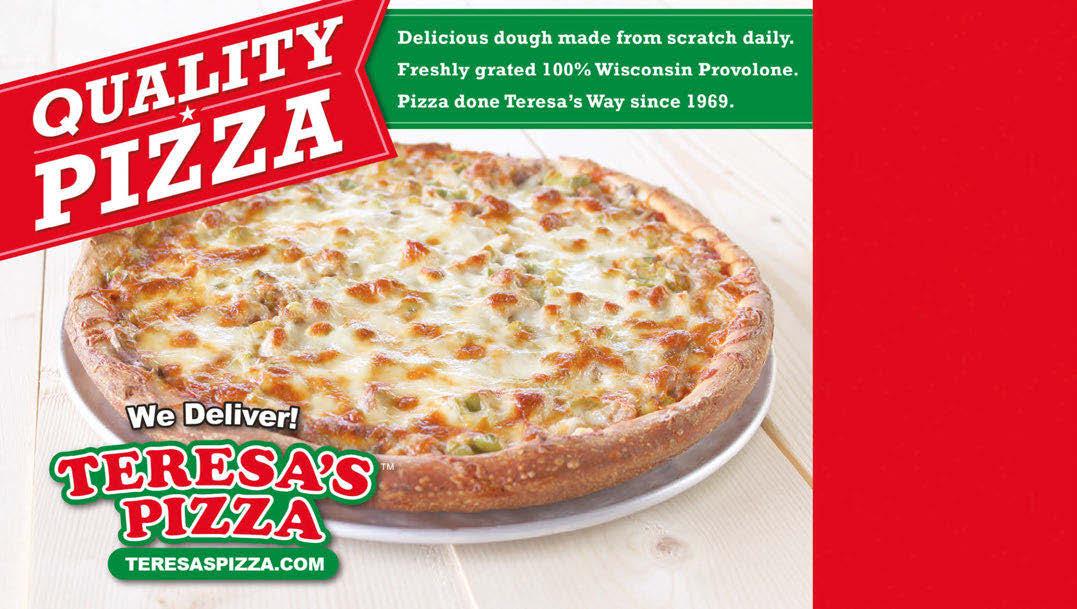 TWINSBURG Shop locally. Save locally. January 2023 Support LOCAL businesses! Must present coupon. Valid only with coupon. Not valid with any other offers. Expires 2/28/23. Must present coupon. Valid only with coupon. Not valid with any other offers. Expires 2/28/23. LARGE 12” 2-TOPPING PIZZA $1399 Not valid with any other offer. Offer valid at Teresa’s of Twinsburg only. Additional charge for chicken and extra cheese will apply. Delivery charge will apply. Offer expires 9/15/16. 2 LARGE 12” 1-TOPPING PIZZAS $2099 Not valid with any other offer. Offer valid at Teresa’s of Twinsburg only. Additional charge for chicken and extra cheese will apply. Delivery charge will apply. Offer expires 9/15/16. X-LARGE 15” 2-TOPPING PIZZA $1799 Not valid with any other offer. Offer valid at Teresa’s of Twinsburg only. Additional charge for chicken and extra cheese will apply. Delivery charge will apply. Offer expires 9/15/16. LARGE 12” 2-TOPPING PIZZA & QUART DINNER SALAD $1799 Not valid with any other offer. Offer valid at Teresa’s of Twinsburg only. Additional charge for chicken and extra cheese will apply. Delivery charge will apply. Offer expires 9/15/16. TWINSBURG 9783 RAVENNA ROAD 330-963-0900 2/17/23. 2/17/23. 2/17/23. 2/17/23. PIZZA & SALAD LARGE 12” 8-CUT 2-TOPPING PIZZA & QUART DINNER SALAD $21.99 2 LARGE 12” 8-CUT 1-TOPPING PIZZAS $24.99 CATERING SPECIALS RIGATONI BAKE, FULL PAN SALAD, AND GARLIC BREAD $75 SMALL 1-TOPPING PIZZA & PT HOUSE SALAD - $12.99 ANY REGULAR SUB & FRENCH FRIES - $9.99 SMALL 2-TOPPING PIZZA - $9.99 LUNCH SPECIALS: 11am-4pm LET US CATER YOUR PARTY! FEEDS 30 1 TOPPING SHEET PIZZA & A FULL PAN SALAD $59.99 (excludes chicken, meatballs & extra cheese)