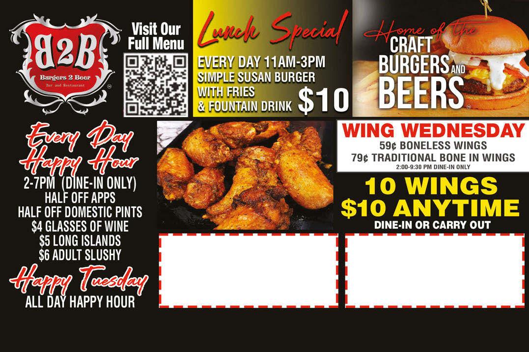 T Off INCLUDES DINE IN AND CARRY OUT Must present TMS coupon. Not valid with any other offer. Expires 2/28/23 $5With A $30 or More Purchase Happy New Year! PURCHASE OF $25 OR MOREPURCHASE OF $60 OR MORE $5 OFF $10 OFF TWINSBURG LOCATION ONLY. EXCLUDES ALCOHOL. MUST PRESENT TMS COUPON. NOT VALID WITH ANY OTHER OFFER OR SPECIAL. EXPIRES 2/16/23 TWINSBURG LOCATION ONLY. EXCLUDES ALCOHOL. MUST PRESENT TMS COUPON. NOT VALID WITH ANY OTHER OFFER OR SPECIAL. EXPIRES 2/16/23 PURCHASE MORE 8941 WILCOX DR. • TWINSBURG • 234-212-1188 Full Menu burgers2beer.com • Hrs: MON-THURS 11AM-10PM • FRI & SAT. 11AM-11PM • SUN: 12PM-9PM 100% GrassBeefFed T T