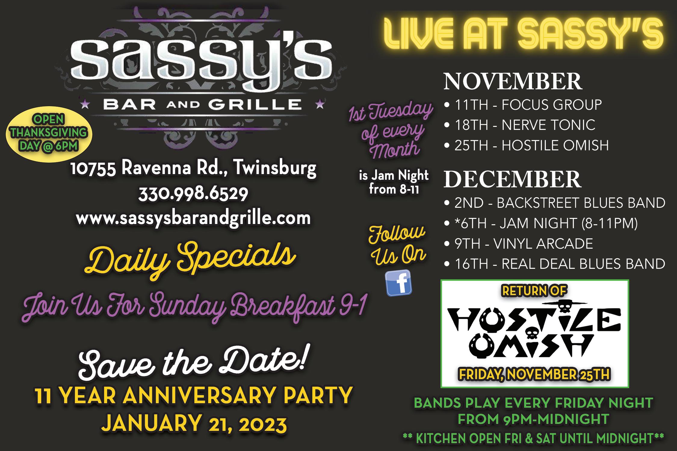 BAR & GRILL Purchase Any Menu Item at Regular Price, Get a 2nd Menu Item of Equal or Lesser Value 1 / 2 O F F Food Only. Dine-In Only. Not valid with other offers. One coupon per table per visit. Valid only at Twinsburg location. Expires 12/15/22. TWINSBURG BAR & GRILL TWINSBURG BAR & GRILL TWINSBURG Visit Us At www.paninisgrill.com Delivery Through 8870 Darrow Rd. TWINSBURG (Located at 91 & I-480) (330) 963-0095 DAILY SPECIALS W E D N E S D AY Wine Wednesday $5 Glasses ALL DAY! Trivia Night all Winter from 6pm to 9pm T H U R S D AY Cigar and Bourbon Night $1 OFF all Bourbons after 8pm Heated Outdoor Bar NOV/DEC LIVE MUSIC NOV 5TH 303 BAND NOV 12TH PALLY BOYS NOV 19TH SHOUT DEC 3RD SPAZMATICS DEC 10TH THE BEAMS DEC 17TH PALLY BOYS NOW SERVING BRUNCH EVERY FRI,SAT,SUN 11AM-3PM DINE IN OR CARRY OUT COME WATCH YOUR FAVORITE NFL TEAM ON NFL TICKET COME WATCH YOUR FAVORITE NFL TEAM ON NFL TICKET FOOD & DRINK SPECIALS FOR ALL THE BROWNS & BUCKEYES GAMES! B o o k Yo u r H o l i d a y Pa r t i e s H e r e !