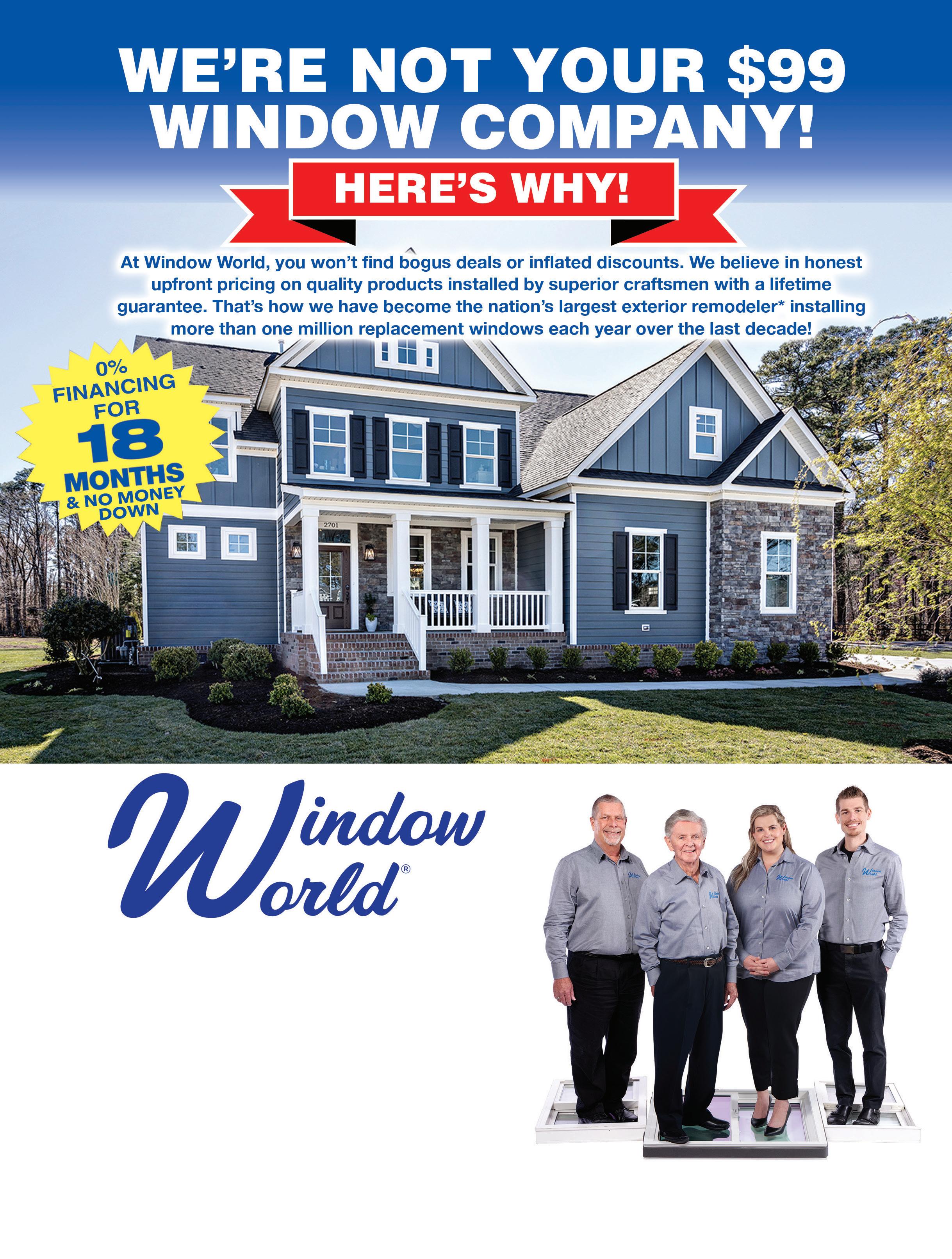 • America’s Largest Exterior Remodeler • Over 20 Million Windows Sold since 1995 FOR FREE IN HOME ESTIMATE, CALL 888-918-0508 VISIT OUR SHOWROOM 2424 Gilchrist Road, Akron www.WindowWorldAkron.com Serving All Akron/Canton Areas This Window World® Franchise is independently owned and operated by Window World Penn-Ohio under license from Window World, Inc. Pat Moran Fred Moran Mandi Fluck Patrick Moran WINDOWS • DOORS • MORE Pittsburgh • Cleveland • Akron • Youngstown • Toledo • Steubenville / Wheeling *2021 Qualified Remodeler / Remodeling Magazine 6 Premium Windows Installed $3,405 or $73/month for 60 months Upgrade to Triple Pane for $6 more/month White Double Hung Windows in any size up to 4’ x 6’. Includes Solazone Insulated Glass. With approved credit. Low 9.99% APR. Exterior trim additional if needed. See store for details. Cannot combine offers.