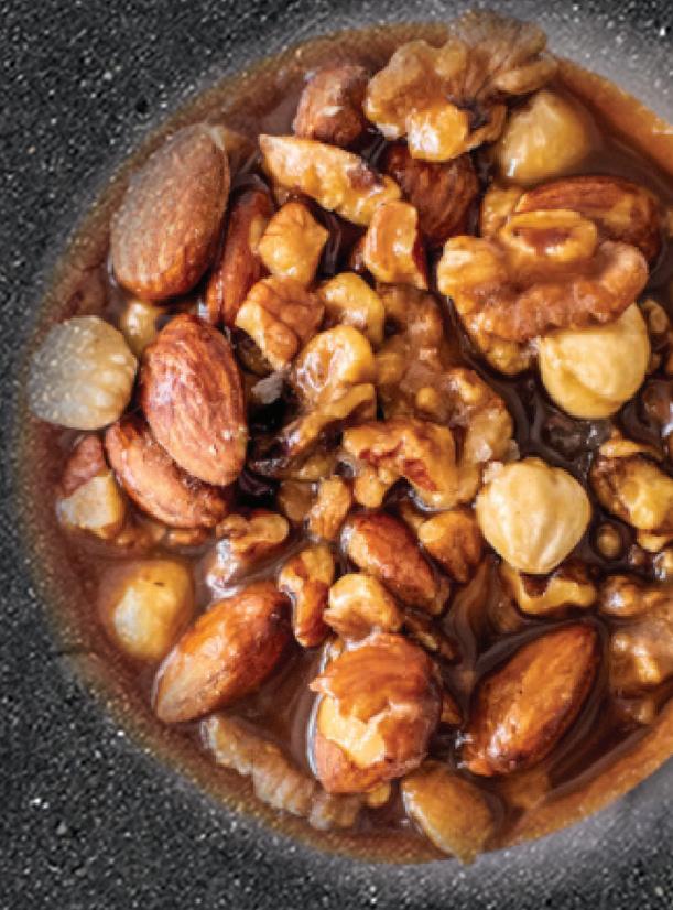 Preheat the oven to 350 degrees. Combine nuts & spread them on a sheet pan, roast for 7 minutes, until they become fragrant. Set aside to cool. Place sugar & ¼ cup of water in a medium (10”) sauté pan and mix with a fork until the sugar is moistened. Cook over medium-high heat until the sugar melts—from this point on, don’t stir the caramel, swirl the pan! Don’t worry—the mixture may look as though it’s crystallizing. Continue to cook 5-10 min., until mixture becomes clear golden brown, swirling the pan constantly at the end. (Careful—the caramel is very hot!) Off the heat, quickly add the vanilla (it will bubble up!) and swirl the pan to combine. Working quickly (the caramel will continue to cook in the pan), add the nuts and the kosher salt and toss with 2 large spoons until the nuts are coated.