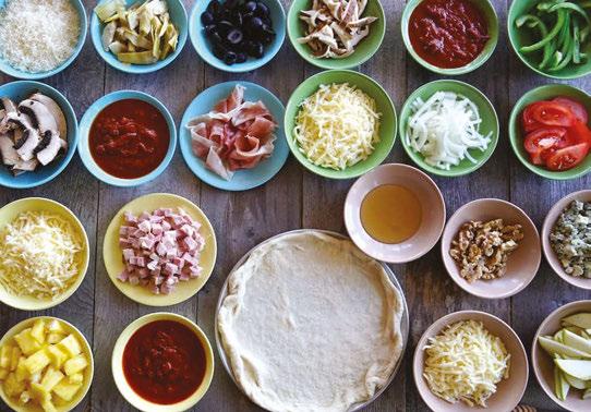 Everyone brings a topping to share... Everyone makes their own pizza, getting as creative as they like with toppings.