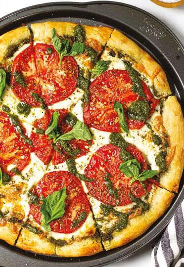 Preheat oven to 450°. Spread pesto on pizza crust. Top with tomatoes, bell peppers, olives, red onions, artichoke hearts and feta cheese. Bake for 8 to 10 minutes.