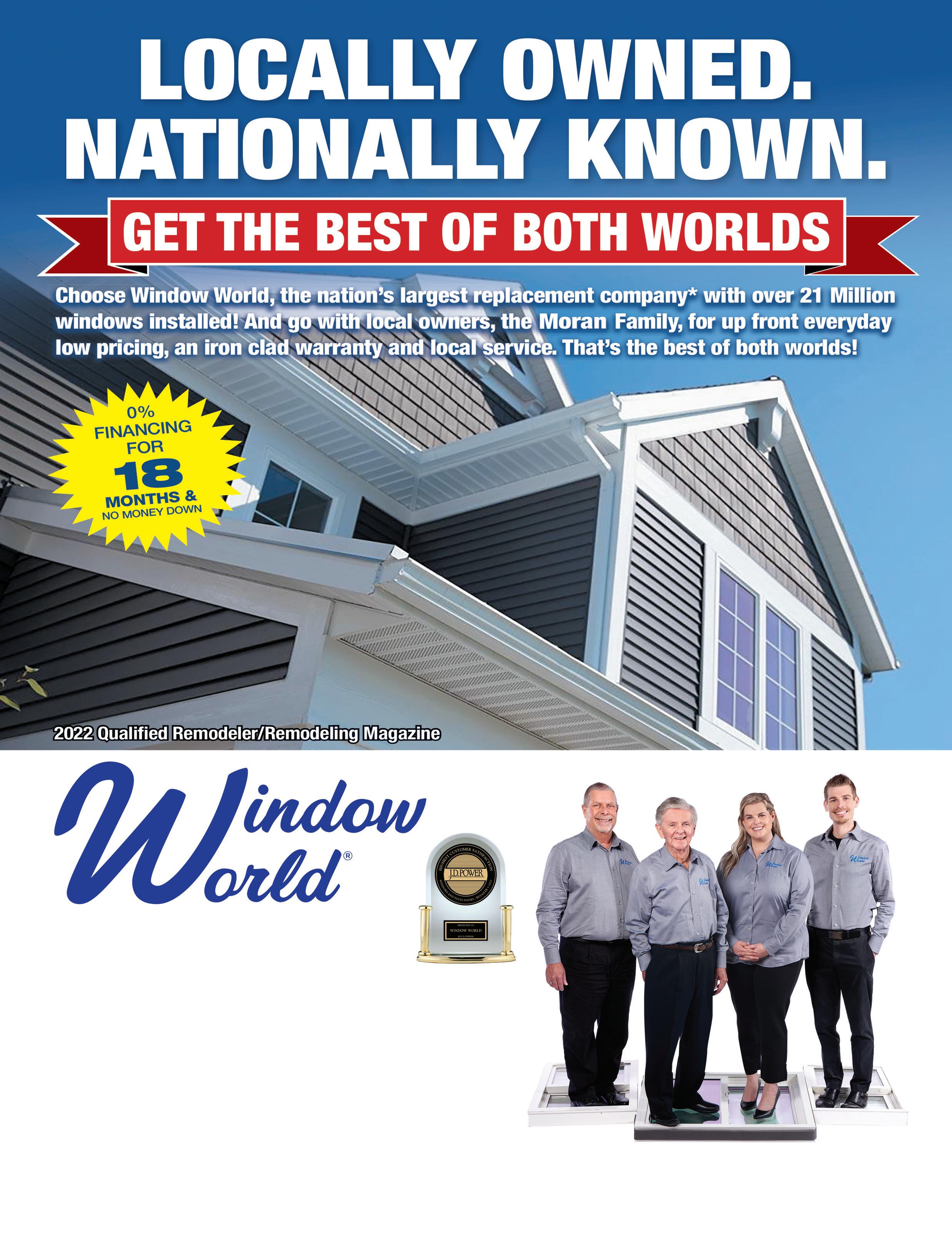 • America’s Largest Exterior Remodeler • Over 21 Million Windows Sold since 1995 FOR FREE IN HOME ESTIMATE, CALL 888-918-0508 VISIT OUR SHOWROOM 2424 Gilchrist Road, Akron www.WindowWorldAkron.com Serving All Akron/Canton Areas Pat Moran Fred Moran Mandi Fluck Patrick Moran WINDOWS • DOORS • MORE Pittsburgh • Cleveland • Akron • Youngstown • Toledo • Steubenville / Wheeling 6 Premium Windows Installed $3,405 or $73/month for 60 months Upgrade to Triple Pane for $6 more/month White Double Hung Windows in any size up to 4’ x 6’. Includes Solazone Insulated Glass. With approved credit. Low 9.99% APR. Exterior trim additional if needed. See store for details. Cannot combine offers. This Window World® Franchise is independently owned and operated by Window World Penn-Ohio under license from Window World, Inc. Ranked #1 For six out the last nine years, WIndow World was ranked number one in customer satisfaction, receiving the highest score in the retailer segment of the J.D. Power 2022 US Windows and Patio Doors Satisfaction Study
