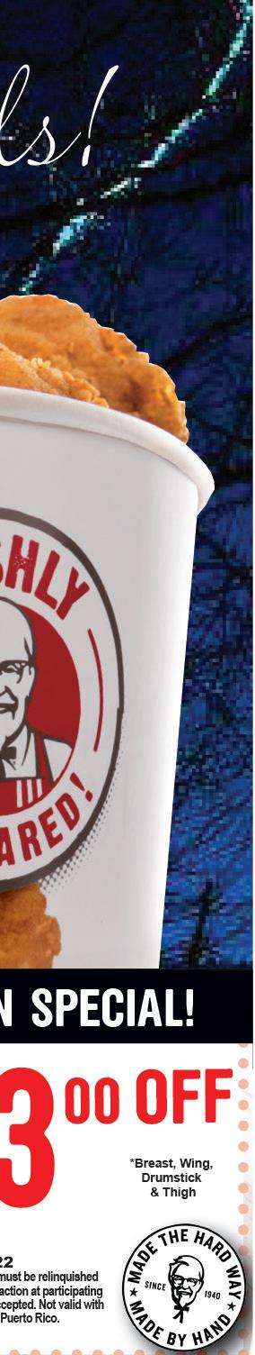 CALL FOR $15 OFF HOME CLEANING 330-324-8176 | invigcleaning.com Residential and Commercial Cleaning Buy 2 Classic Chicken Dinners Get a 3rd Classic Chicken Dinner FREE For a Full Menu: www.whitehousechicken.com EXCLUDING DRUMMETTE DINNERS Tuesday Special NO COUPON NECESSARY NOT VALID IN CONJUNCTION WITH ANY ONLINE CHOW NOW ORDERS. Limit one coupon per customer. Must present coupon at time of purchase. Not valid with any other offer. Valid at Green location only. Expires 11/10/22 NOT VALID IN CONJUNCTION WITH ANY ONLINE CHOW NOW ORDERS. Limit one coupon per customer. Must present coupon at time of purchase. Not valid with any other offer. Valid at Green location only. Expires 11/10/22 Classic Chicken Dinner $1095 Thursday Special 4pc. Chicken Tender Dinner $1095 GREEN 4195 Massillon Rd. (Located in the Green Plaza) 330-896-5644 Hours: Mon 4pm-8pm • Tues, Wed, Thurs 4pm-9pm Fri & Sat 11am-9pm • Sun 11am-8pm Buy a 16pc Mixed or 20pc Tender Bucket Get $5.00 OFF Order with ChowNow or @www.whitehousechicken.com go to online ordering or on our Facebook Page We now have our own app through Chow Now! Download to your phone for online ordering and delivery through Chow Now at both Wadsworth and Green locations. Sign up for our new loyalty program through Chow Now! DOWNLOAD OUR NEW APP TODAY! Order Online with GREEN/PORTAGE LAKES/FIRESTONE PARK October 2022 Shop local. Drive less. Save more.