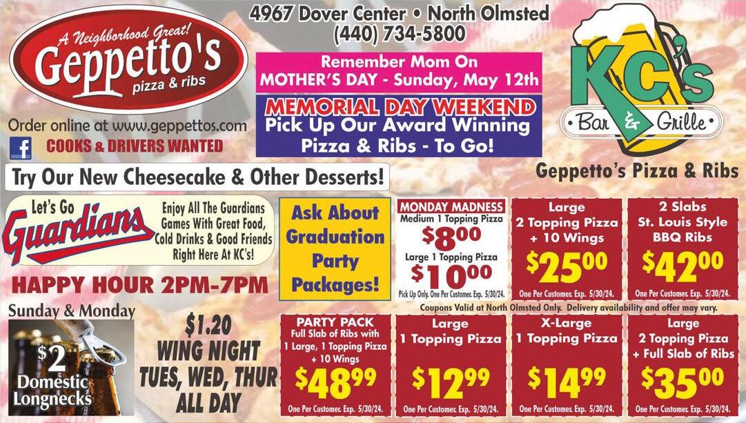 29691 Lorain Road North Olmsted 440-779-0444 Mon-Sat 4-•Sun 4-8 9 Take-outAvailable $ 5 OFF $ 10OFF With Two Beverage Purchase With coupon. Expires5-30-24 CELEBRATING OURANNIVERSARY! 32ND $25 purchase $50 purchase Corso’s Restaurant ITALIAN & AMERICAN FOOD NO Smart Scapes Smart Scapes Smart Scapes Mowing Only Package •Weekly mow, edge, trim •Bag/pickup grass clippings as needed Lawn Care Only Package Smart Scapes Economy Plan 5 Applications of Turf Fertilization Basic Plan 6 Applications of Turf Fertilization Deluxe Plan 6 Applications of Turf Fertilization + Grub Control Premium Plan 6 Applications of Turf Fertilization + Grub Control And Fall Aeration You choose the plan that’s right for you! •Mowing, Edging, Trimming Fertilization &Aeration •Turf Spring & Fall Clean-ups • Weekly Garden Maintenance & Care • Horticultural Pruning • Landscape Enhancements • •Snow & Ice Management Smart ScapesServices WE ARE YOUR LAWN CARE SOLUTION Can’t We All Just Get A Lawn? Can’t We All Just Get A Lawn? $0.00OFF8 $50.00 OFF1 FERTILIZATION 50% OFF FIRST APPLICATION SEASONAL MOWING PROGRAM NEW SERVICE When you prepay for a DELUXE OR PREMIUM LAWN CARE PROGRAM (Does not include leaf, twig, branch or additional clean-up) Any Spring Clean-Up•Landscape Pruning 440-235-2356 440-235-2356 440-235-2356 Call for details. Not valid with other offers/dicounts. Expires-245-30 Call for details. Not valid with other offers/dicounts. Expires-245-30 Call for details. Not valid with other offers/dicounts. Expires-245-30 440-235-2356 8997 Columbia Rd. Olmsted Falls Like us on: info@smartscapesoh.com•www.smartscapesoh.com New Clients Only New Clients Only New Clients Only When You Pay For A Seasonal Contract PROUDLYSERVING THE COMMUNITYFOR 35+YEARS! SERVICES: TREE REMOVAL • TREE TRIMMING STUMP GRINDING Valid with coupon. Not valid with any other offers. Expires 5/30/24 $100 OFF ANY JOB $1000 OR MORE Valid with coupon. Not valid with any other offers. Expires 5/30/24 $50 OFF ANY JOB $500 OR MORE
