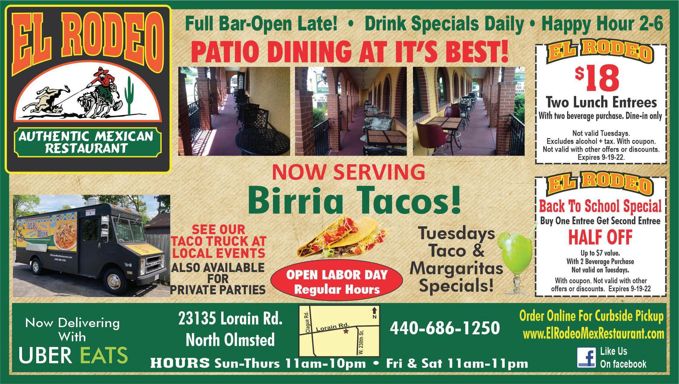 34900 Center Ridge Road•North Ridgeville 440-327-3898 HOURS:-Sat 7am-pm•Sunday 7am-2pm Tue8 City Diner With this coupon. Not valid with any other offers or discounts. One coupon per table. Expires9-15-22 ExcludesAlcohol. With this coupon. Not valid with any other offers or discounts. One coupon per table. Expires9-15-22 ExcludesAlcohol. With this coupon. Not valid with any other offers or discounts. One coupon per table. Expires9-15-22 ExcludesAlcohol. Any purchase over $20.00 Any purchase over $.00 30 Any purchase over $.00 40 Early Rise & Shine Special Every Day•7am-11am Two extra large eggs,hoice of two strips of bacon c or two sausages,ome fried potatoes and toast. h Two extra large eggs,hoice of two strips of bacon c or two sausages,ome fried potatoes and toast. h $499 Now delivering with Visit www.mycitydiner.net to place your order. 8oz Hand Cut Sirloin Steak $1349 All made with 100% Angus Ground Chuck Try One Of Our Gourmet Burgers! City Diner Favorites Westlake 30610 Detroit Rd. 440-835-6935 $400 OFF Any Purchase of $20 or More (Tax Not Included) Dine In Only. Valid at all locations listed. One coupon per table per party. Not valid w/any other offers or special of the day. Not valid on alcohol. Exp 9-15-22. $600 OFF Any Purchase of $30 or More (Tax Not Included) Dine In Only. Valid at all locations listed. One coupon per table per party. Not valid w/any other offers or special of the day. Not valid on alcohol. Exp 9-15-22. $1000 OFF Any Purchase of $50 or More (Tax Not Included) Dine In Only. Valid at all locations listed. One coupon per table per party. Not valid w/any other offers or special of the day. Not valid on alcohol. Exp 9-15-22. NO NO NO Additional Parking in Rear N S Crocker Bradley Detroit RT 90 FREE WIFI Serving Liquor 7 Days a Week! Dine-In/Carryout Prepared Fresh Daily ONLINE ORDERING Visit donramon-granfiestamex.com for other locations & menu Visit donramon-granfiestamex.com for other locations & menu Don Ramon Mex Westlake Gift Certificates Available