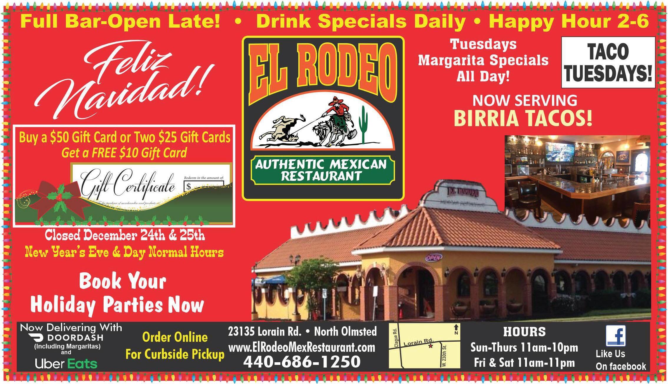 Italian & American Food 29691 Lorain Road•North Olmsted 440-779-0444 Mon-Sat 4-•Sun 4-8 9 Take-outAvailable $10 OFF $5 OFF With Two Beverage Purchase NO Corso’s Restaurant With coupon. Expires1-19-23 Celebrating Ourth Anniversary! 30 $25 purchase $50 purchase $400 OFF Any Purchase of $20 or More (Tax Not Included) Dine In Only. Valid at all locations listed. One coupon per table per party. Not valid w/any other offers or special of the day. Not valid on alcohol. Exp 1-19-23. $600 OFF Any Purchase of $30 or More (Tax Not Included) Dine In Only. Valid at all locations listed. One coupon per table per party. Not valid w/any other offers or special of the day. Not valid on alcohol. Exp 1-19-23. $1000 OFF Any Purchase of $50 or More (Tax Not Included) Dine In Only. Valid at all locations listed. One coupon per table per party. Not valid w/any other offers or special of the day. Not valid on alcohol. Exp 1-19-23. NO NO NO Additional Parking in Rear N S Crocker Bradley Detroit RT 90 FREE WIFI Serving Liquor 7 Days a Week! Dine-In/Carryout Prepared Fresh Daily ONLINE ORDERING Visit donramon-granfiestamex.com for other locations & menu Visit donramon-granfiestamex.com for locations & Don Ramon Mex Westlake Gift Certificates Available Westlake 30610 Detroit Rd. 440-835-6935 Restrictions May Apply. Offer valid thru 12/31/22 HOLIDAY GATHERING? CALL FOR A RESERVATION. Closed EveChristmas & Day Open New Year’s Eve & Day