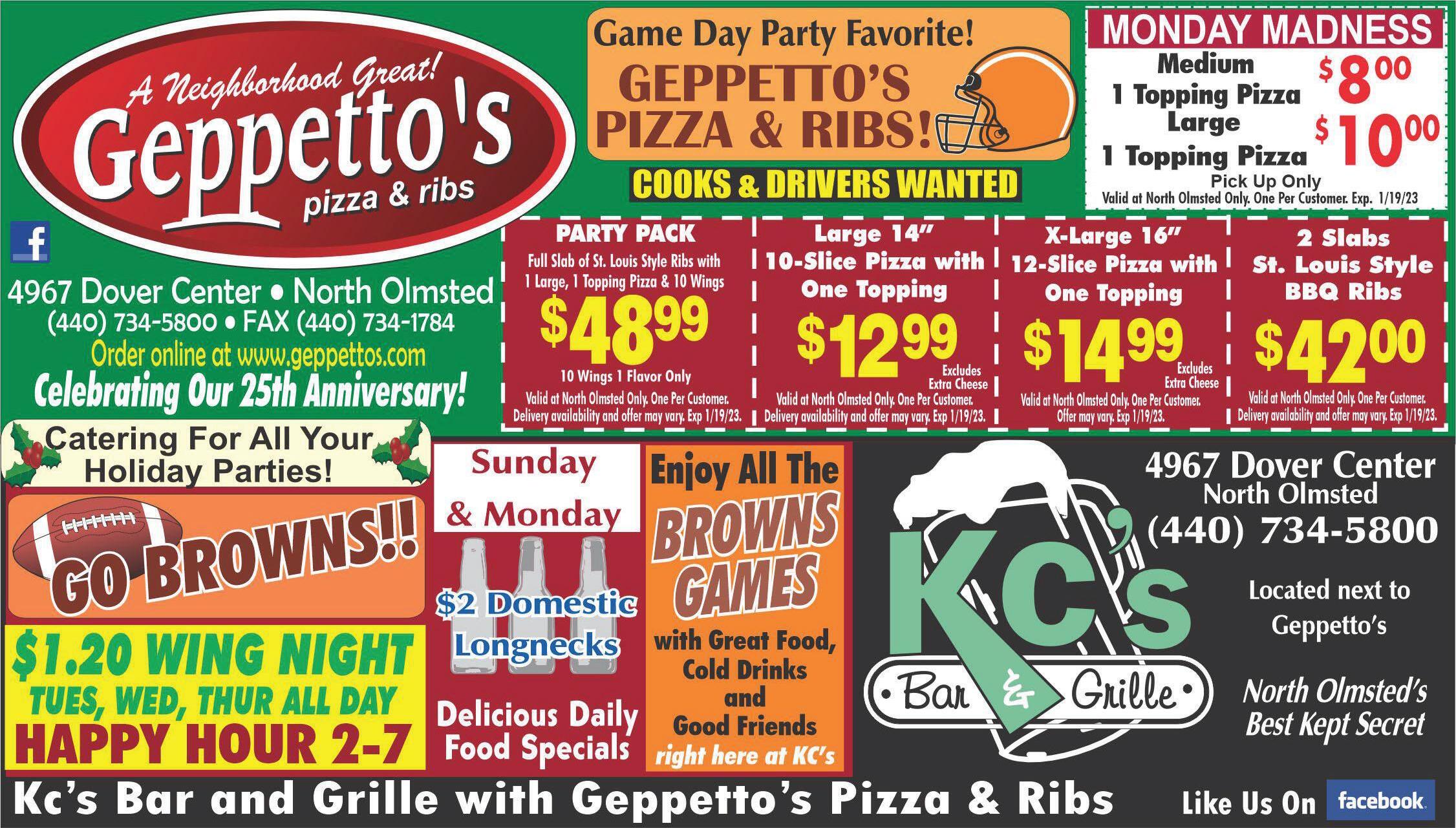 FREE Delivery In North Olmsted - DELIVERY 11am-Midnight $.00 min. order 9 DAILY LUNCH & DINNER SPECIALS $19.50 $19.50 Add’l toppings $1.50 each Excludes extra cheese Add’l toppings $.50 each 2 Excludes extra cheese Add’l toppings $1.50 each Excludes extra cheese SAVE 8.00 $ SAVE 8.00 $ 2 LARGE 2 ITEM 2 LARGE 2 ITEM With coupon. Not valid with other offers. Expires1-19-23 With coupon. Not valid with other offers. Expires1-19-23 With coupon. Not valid with other offers. Expires1-19-23 With coupon. Not valid with other offers. Expires1-19-23 With coupon. Not valid with other offers. Expires1-19-23 With coupon. Not valid with other offers. Expires1-19-23 With coupon. Not valid with other offers. Expires1-19-23 With coupon. Not valid with other offers. Expires1-19-23 With coupon. Not valid with other offers. Expires1-19-23 A’S RTURO A’S RTURO A’S RTURO A’S RTURO A’S RTURO A’S RTURO A’S RTURO A’S RTURO A’S RTURO A’S RTURO Add’l toppings $1.75 each $13.99 $14.99 X-Large 16”, 12 cut 1-Item Pizza Half Sheet 1-Item Pizza $27.25 Add’l. toppings $3.each 75 Excludes extra cheese SHEET PIZZA SPIZZAS MALL X-LARGE or HALF SHEET 2 Large 12”,8 Cut, 2 Item Pizzas 2 Large 12”,8 Cut, 2 Item Pizzas FULL SHEET, 40 Cut 1 Item Pizza LUNCH SPECIALS DAILY• KITCHEN OPEN 11:00am - 12:am•45HOURS SUBJECT TO CHANGE OPEN 7 DAYS A WEEK $1.799 Large 12”8 cut 1 Item Pizza Salad & Side PIZZA &SALAD Add’l toppings $1.50 each• Excludes extra cheese Add’l toppings $1.50 each• Excludes extra cheese Add’l toppings $1.75 each 2 Small 1 Item Pizzas $17.50 $10.99 $13.99 Large 12”, 8 cut X-Large 16”, 12 cut 1 Item Pizzas MON, TUES & WEDS ONLY MON, TUES & WEDS (equal or lesser value) Buy One Get One With Beverages Excludes Fish Fry Any Entree HALF OFF DINE IN SPECIAL 4 piece & 6 JoJo’s $.9 124 8piece&8JoJo’s$1.9 74 12piece&12JoJo’s$.9 214 16piece&16JoJo’s$2.9 64 24piece&24JoJo’s$9 35.9 w/Coleslaw ARTURO’S CHICKEN 50 pieces Chicken Only $5.99 9 Large Cheese Pizza $.95 8 BOGO HalfOffCoupon NotValid Add’l. toppings $3.each 75 Excludes extra cheese $3.99 6 FULL SHEET, 1 Item Pizza &10 Wings SHEET &SALAD Where do you get late night pizza? Taking Pizza Orders Up to 12:45am Every Day ARTURO’S! Your Choice $10.50 BANQUET CATERING ORDERS REQUIREA24 HOUR NOTICE PLEASE Dine In Only Large 1 Item Pizza Tall Domestic Draft 6Buffalo Wings with Bleu Cheese or ranch & celery $ 2.99 0 With coupon. Not valid with other offers. Expires 1-19-23 PRIVATE PARTY ROOM WEDDING/BABYSHOWERS•BIRTHDAYS REHEARSALDINNERS FUNERALLUNCHEONS Taking Reservations•Catering Menu Starting at $9.95/pp Great ForAny Occasion! Perfect For Holiday Parties! BOOK YOUR HOLIDAY PARTY NOW! 440- 777-2420 26679 Brookpark Ext. North Olmsted Find Us On FREE Wi-Fi Happy Hour 11am-7pm Also Serving Fairview, Westlake, Olmsted Falls + Domestic Bottles $2.50 11am-7pm 38