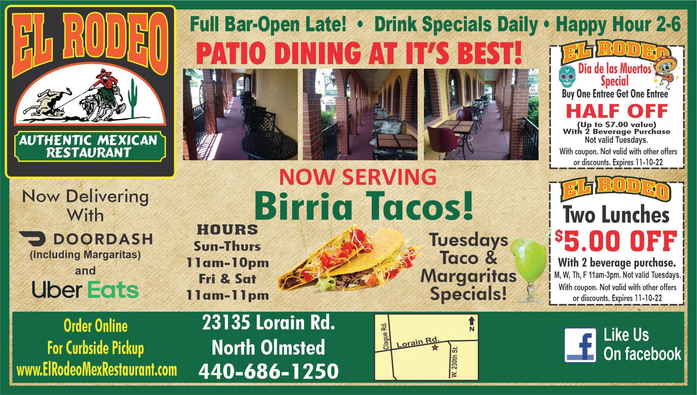 ROCKY RIVER 20649 Center Ridge Rd. 216-712-4521 NORTH RIDGEVILLE 34250 Center Ridge Rd. 440-657-5054 Valid at Rocky River or North only Ridgeville Valid at Rocky River or Northe only Ridgevill NEW STORES NEARYOU! Hours M-F 7am-9pm Sat 8am-9pm Sun 10am-8pm DOWNLOAD OUR APP TODAY FOR $2.00 OFF YOUR FIRST PURCHASE OFFER EXPIRES: 11/10/2022 OFFER EXPIRES: 11/10/2022 Delivery With Uber, Door Dash, Grub Hub Not valid with other offers or discounts. Westlake 30610 Detroit Rd. 440-835-6935 $400 OFF Any Purchase of $20 or More (Tax Not Included) Dine In Only. Valid at all locations listed. One coupon per table per party. Not valid w/any other offers or special of the day. Not valid on alcohol. Exp 11-10-22. $600 OFF Any Purchase of $30 or More (Tax Not Included) Dine In Only. Valid at all locations listed. One coupon per table per party. Not valid w/any other offers or special of the day. Not valid on alcohol. Exp 11-10-22. $1000 OFF Any Purchase of $50 or More (Tax Not Included) Dine In Only. Valid at all locations listed. One coupon per table per party. Not valid w/any other offers or special of the day. Not valid on alcohol. Exp 11-10-22. NO NO NO Additional Parking in Rear N S Crocker Bradley Detroit RT 90 FREE WIFI Serving Liquor 7 Days a Week! Dine-In/Carryout Prepared Fresh Daily ONLINE ORDERING Visit donramon-granfiestamex.com for other locations & menu Visit donramon-granfiestamex.com for locations & Happy Hour Drink Specials (excludes top shelf & homemade sangria) Choose from Lime & Strawberry Margaritas Mon.-Fri. 3:00pm-6:00pm FREE Fried Ice Cream Saturday, Oct. 16th (With Purchase of 2 Dinner Entrees. Must Mention Ad) Don Ramon Mex Westlake 20% OFF YOUR TOTAL BILL All Day Long Not to be combined with any other offer or coupon CELEBRATING HALF WAY TO THURSDAY, NOVEMBER 4TH Gift Certificates Available