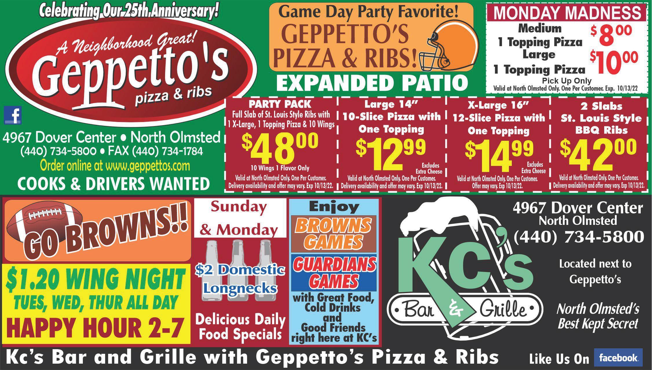 FREE Delivery In North Olmsted - DELIVERY 11am-Midnight $.00 min. order 9 DAILY LUNCH & DINNER SPECIALS $18.99 $18.99 Add’l toppings $1.50 each Excludes extra cheese Add’l toppings $.50 each 2 Excludes extra cheese Add’l toppings $1.50 each Excludes extra cheese SAVE 7.51 $ SAVE 7.51 $ 2 LARGE 2 ITEM 2 LARGE 2 ITEM With coupon. Not valid with other offers. Expires10-13-22 With coupon. Not valid with other offers. Expires10-13-22 With coupon. Not valid with other offers. Expires10-13-22 With coupon. Not valid with other offers. Expires10-13-22 With coupon. Not valid with other offers. Expires10-13-22 With coupon. Not valid with other offers. Expires10-13-22 With coupon. Not valid with other offers. Expires10-13-22 With coupon. Not valid with other offers. Expires10-13-22 With coupon. Not valid with other offers. Expires10-13-22 A’S RTURO A’S RTURO A’S RTURO A’S RTURO A’S RTURO A’S RTURO A’S RTURO A’S RTURO A’S RTURO A’S RTURO Add’l toppings $1.75 each $13.99 $14.99 X-Large 16”, 12 cut 1-Item Pizza Half Sheet 1-Item Pizza $26.99 Add’l. toppings $3.each 75 Excludes extra cheese SHEET PIZZA SPIZZAS MALL X-LARGE or HALF SHEET 2 Large 12”,8 Cut, 2 Item Pizzas 2 Large 12”,8 Cut, 2 Item Pizzas FULL SHEET, 40 Cut 1 Item Pizza LUNCH SPECIALS DAILY• KITCHEN OPEN 11:00am - 12:am•45HOURS SUBJECT TO CHANGE OPEN 7 DAYS A WEEK $1.799 Large 12”8 cut 1 Item Pizza Large Salad & with Cheese PIZZA &SALAD Add’l toppings $1.50 each• Excludes extra cheese Add’l toppings $1.50 each• Excludes extra cheese Add’l toppings $1.75 each 2 Small 1 Item Pizzas $17.50 $10.99 $13.99 Large 12”, 8 cut X-Large 16”, 12 cut 1 Item Pizzas MON, TUES & WEDS ONLY MON, TUES & WEDS (equal or lesser value) Buy One Get One With Beverages Excludes Fish Fry Any Entree HALF OFF DINE IN SPECIAL 4 piece & 6 JoJo’s $.9 124 8piece&8JoJo’s$1.9 74 12piece&12JoJo’s$.9 214 16piece&16JoJo’s$2.9 64 24piece&24JoJo’s$9 34.9 w/Coleslaw ARTURO’S CHICKEN 50 pieces Chicken Only $5.99 9 Large Cheese Pizza $.95 8 BOGO HalfOffCoupon NotValid 440- 777-2420 26679 Brookpark Ext. North Olmsted FREE Wi-Fi Happy Hour 11am-7pm Also Serving Fairview, Westlake, Olmsted Falls + Domestic Bottles $2.25 11am-7pm Find Us On Fresh Dough Made Daily Fresh Veggies Add’l. toppings $3.each 75 Excludes extra cheese $33.99 FULL SHEET, 1 Item Pizza & Large Salad with Cheese SHEET &SALAD Where do you get late night pizza? Taking Pizza Orders Up to 12:45am Every Day ARTURO’S! Your Choice $10.50 With coupon. Not valid with other offers. Expires10-13-22 With coupon. Not valid with other offers. Expires10-13-22 A’S RTURO A’S RTURO $.825 $.99 22 $1.599 RIB DINNER Italian Sub (Hot or Cold) or Meatball Sub Half Slab Full Slab with coleslaw & fries Large Party Room ForAny Occasion FOOTBALLFANTASYDRAFTS BANQUET CATERING ORDERS REQUIREA24 HOUR NOTICE PLEASE SUB SPECIAL Protect Your Gutters WITHTHE #1 MICRO-MESH GUARD ONTHE MARKET! 440-595-3896 thegutterboys.com GUARDSTTER | GUS | CLEANING The Gutter Boys 440-732-4056 CALL TODAY FOR A FREE ONSITE CONSULTATION AND ESTIMATE! Expires•COUPON CODE: 10/13/22 TMS09 $500OFF $250OFF Whole House Guard Installation Whole House Seamless GuInstallation tter 100 ft minimum purchase required. Present ad. Terms and restrictions apply. Not valid with any other offers. TMS ad must be mentioned. Offer expires/22. TMS0 10/139 “Go with Northeast Ohio's Highest Rated Power Washing Company”- Owner Ken Wilson PristineClean.com Pristine Clean Features an Eco-Friendly Process House Washing | Roof Cleaning | Concrete Washing & Sealing Financing Available More Than Just A Power Washing Wash |Protect |Renew We’ve Stocked Up! Most Jobs Complete Within A Couple Of Weeks! Owner -AnthonyAlberino Concrete Washing & Sealing Roof Washing HouseWashing No Interest Or Payments For 18 Months LATE SUMMER SALE $70 off 1 service, $100 off 2 services, and $130 off 3 services. Terms and restrictions apply, and cannot be combined with any other deals. For full house wash, roof cleaning, roof renew and concrete washing & sealing jobs.