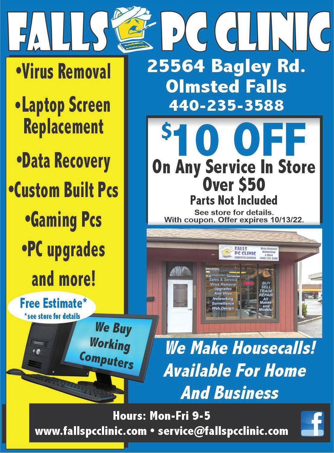 NORTH OLMSTED Pat’s Cleaners 28210 Lorain Road North Olmsted (Corner Of Lorain & West Park Dr.) (440) 777-0011 27339 Detroit Rd. Westlake (Corner Of Detroit & Dover) (440) 835-4820 34297 Center Ridge Rd. North Ridgeville (Rini’s Plaza) (440) 327-1013 35925 Detroit Rd. Avon (Near Marc’s) (440) 937-5757 Owner Operated Since 1964 •Wedding Gown Cleaned & Preserved •Leather Cleaning•Alterations Available LEANZA’S Shoe & Leather Repair (216) 676-5610 North Olmsted Open Monday-Friday 7am-7pm & Saturday 8am-6pm SAVE On 100% Green Eco-Friendly Dry Cleaning 89$1 89$1 Men’s Business Shirts (On Hangers) Men’s Business Shirts (On Hangers) Some Restrictions apply. Expires 10/13/22 Some Restrictions apply. Expires 10/13/22 % OFF 25 % OFF 25 % OFF 25 % OFF 25 All Dry Cleaning All Dry Cleaning (Not valid on Wedding Dresses, Leather Goods or Household Items) (Not valid on Wedding Dresses, Leather Goods or Household Items) No limit. Present coupon with incoming order. Not valid with any other offer. Expires 10/13/22 No limit. Present coupon with incoming order. Not valid with any other offer. Expires 10/13/22 Dry Cleaning of Household Items, Bedspreads & Drapes Dry Cleaning of Household Items, Bedspreads & Drapes (Not Valid On In Home Service) No limit. Present coupon with incoming order. Not valid with any other offer. Expires 10/13/22 (Not Valid On In Home Service) No limit. Present coupon with incoming order. Not valid with any other offer. Expires 10/13/22 NO NO NO NO NO NO September 2022 Support LOCAL businesses! Shop local. Drive less. Save more.