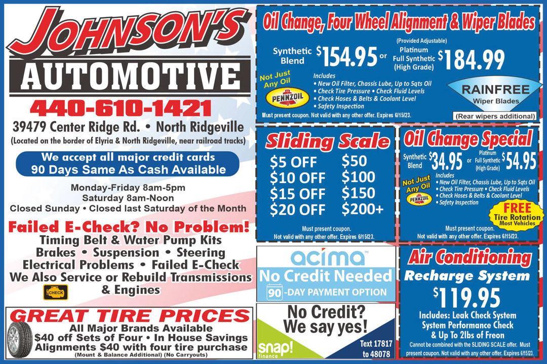 CALL FOR AN INSTANT QUOTE! 440-595-3896 MORE THAN JUST A POWER WASH... WASH - RENEW - PROTECT Terms and conditions apply. Discounts only apply to house wash, roofcleaning, and concrete driveway washing and sealing services only. Not valid with any other offer. Ad must be mentioned at the time ofsale. EXPIRES5-23•CODE TMS0 6-1 5 THEGUTTERBOYS.COM GUARDS /TTER/ GUS CLEANING / GUTTER INSTALLATION / WINDOW CLEANING The Gutter Boys WITH THE #1 RATED GUARD IN AMERICA! $500 OFF Whole House Gutter Guard and/or Seamless Gutter Installation Present ad. Terms and restrictions apply. Not valid with any other offers. TMS ad must be mentioned. Offer expires5/23 TMS6/105 PROFESSIONAL GUTTER SOLUTIONS! Anthony Alberino, Owner CALL TODAY & RECEIVE SAMAS CASH E FINANCING 440-732-4056 KEN WILSON OWNER PristineCleanm.co $70 OFF $0OFF10 $0OFF13 POWER WASHING HOUSE | ROOF | CONCRETE WASH & SEAL 15 SINGLE SERVICE TWO SERVICES THREE SERVICES Hours: Mon.-Fri. 8am-6pm Ohio E Check VEHICLE EMISSION REPAIRS PERFORMED HERE 38070 Center Ridge Rd.•North Ridgeville 440-327-0016 Follow Us On FREE Loaners & Shuttle Service For Veterans & City Service Personnel 10% OFF ALL MAJOR TIRE BRANDS AVAILABLE TEXT: 29245 TO: 48078 Financing Available DISCOUNTS COMPLETECLEIAGNOSTICSLECTRICALXPERTS DEE VEHI CMOMPLETEECHANICAL Shocks, Struts, Tires, Bearings, Batteries, Brakes Specializing in all high performance work. Complete Automotive Repair and Maintenance On All Makes / Models With coupon. Not valid with other offers. Expires 6-15-23. There may be an additional fee to reset/repair TPMS Sensors. With coupon. Not valid with other offers. Expires 6-15-23. There may be an additional fee to reset/repair TPMS Sensors. With coupon. Not valid with other offers. Expires 6-15-23. There may be an additional fee to reset/repair TPMS Sensors. SteveAli’s SteveAli’s .info Specializing In Fleets Locally Owned &Operated GO RANGERS! AutomotiveAccessories HAVE A SAFE MEMORIAL DAY WEEKEND Air Conditioning Inspection •Check Controls •SystemPerformance Test •Check Drive Belts & Hoses •Refrigerant and Dye Extra •Check Heating & Cooling Systems •Leak Test All Components & Connectors $95 49. $5 OFF With coupon. Not valid with other offers. Expires 6-15-23. There may be an additional fee to reset/repair TPMS Sensors. $10 OFF $20 OFF $30 OFF $100 Spent On Any Service $200 Spent On Any Service $300 Spent On Any Service Any Regularly Priced Oil, Lube & Filter Change Plus a FREE Vehicle Safety Inspection $50 OFF Brake Special With 2 Year/Unlimited Mileage Warranty PerAxle HIRING ALL POSITIONS
