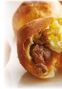 Separate each biscuit in half. Press each into a 4-inch round. Spoon 1 heaping tablespoon full of each eggs, meat & cheese onto center of each round. Gently fold edges up and over lling; pinch to seal. In small bowl, make egg wash by mixing remaining egg and water. Brush on biscuits on all sides.