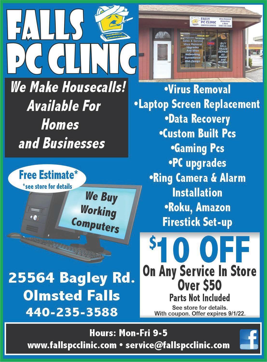 KNAPPSAUTOTOW.COM 7223 Stearns Rd.•Olmsted Twp. (1/4 mile South of I-480) 440.235.1127 CALL ROB FOR A FREE ESTIMATE! Email: Knappsautoolmsted@gmail.com SAME DAY SERVICE AVAILABLE Two Year 24,000 Warranty HOURS M-F 8-5 Locally Owned & Operated by Olmsted Falls Grads! Oil Change $ 39 .95 $ 139 .95 $ 59 .95 Some Restrictions may apply. With coupon. Expires9-1-22. Some Restrictions may apply. With coupon. Expires9-1-22. 5% Discount For AAA Members Loaner Cars Synthetic Blend A/C Performance Check Includes 1 lb Freon Evaluate System Inspect Components, Belts Hoses & Temperatures Full Synthetic Includes up to 5qts New FilterLube & Ask About FREE TWith Repairs OWING CERTIFIED BACK TO SCHOOL SPECIAL Make Safe Driving A Priority For Your Student Oil Change Tire Rotation 75 Point Safety Inspection FREE Air Conditioning Inspection (synthetic blend. Includes up to 5qts.) $ 39 .95 Some Restrictions may apply. With coupon. Expires9-1-22. Must present coupon. Not valid with other offers, specials or promotions. Expires9-1-22. Only valid at North Ridgeville location. Must present coupon. Not valid with other offers, specials or promotions. Expires-29-12 Only valid at North Ridgeville location. Must present coupon. Not valid with other offers, specials or promotions. Expires-29-12 Only valid at North Ridgeville location. $99 13 Mix & Match Any 2 Two Topping Stromblis or Calzones www.orderpizzpan.com $00 4No Limit (Add’l Toppings Extra) P s i z k z c i a t S • d C a a e l z r o B n y e s s e • e h S C t r • o m s d b a o l l a i S • • s b u S • s n i W • s r e z i t e p p A • s b i Rg TAKE THE NIGHT OFF $2599 Offer expires-29-12. 33009 Lorain Rd.•North Ridgeville 440-309-4999 Pickup & Delivery Available Closed Mondays Full Lunch & Dinner Menu Check Out Our Catering Menu For All Your Parties & Special Events! Near Turnpike $2199 Jumbo Topping Pizza 2 Plus One Pound of Wings Lunch Special 1 Topping Personal Pan Pizza •Half Sheet 2 Topping Pizza •Slab of Ribs •2 Liter of Pop Tues-Thurs Only We’ll Cook For You! (11am-3pm only) Protect Your Gutters WITHTHE #1 MICRO-MESH GUARD ONTHE MARKET! 440-595-3896 thegutterboys.com GUARDSTTER | GUS | CLEANING The Gutter Boys 440-732-4056 CALL TODAY FOR A FREE ONSITE CONSULTATION AND ESTIMATE! Expires•COUPON CODE: 9/1/22 TMS08 $500OFF $250OFF Whole House Guard Installation Whole House Seamless Guard Installation 100 ft minimum purchase required. Present ad. Terms and restrictions apply. Not valid with any other offers. TMS ad must be mentioned. Offer expires 9/1/22. TMS08 “Go with Northeast Ohio's Highest Rated Power Washing Company”- Owner Ken Wilson PristineClean.com Pristine Clean Features an Eco-Friendly Process House Washing | Roof Cleaning | Concrete Washing & Sealing Financing Available More Than Just A Power Washing Wash |Protect |Renew We’ve Stocked Up! Most Jobs Complete Within A Couple Of Weeks! Owner -AnthonyAlberino Concrete Washing & Sealing Roof Washing HouseWashing No Interest Or Payments For 18 Months Terms and restrictions apply. Cannot be combined with any other offer. For Full House, Roof CleanConcrete Driveway Wash & Seal. or Jobs Only 20% Off Power Washing Our Biggest Discount Ever!